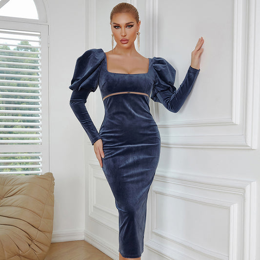 Puff Long Sleeve Mesh Midi Velvet Dress
