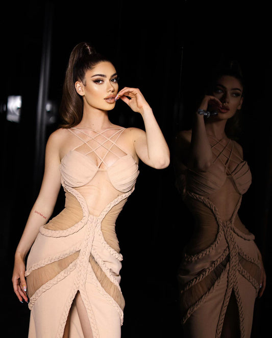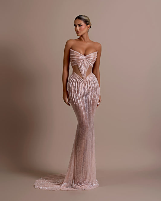 Strapless Crystal Sequin Corset Maxi Dress Nude HV1916