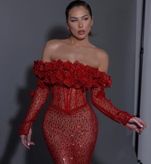 Long Sleeve Floral Bardot Sequin Maxi Dress Red HV1798