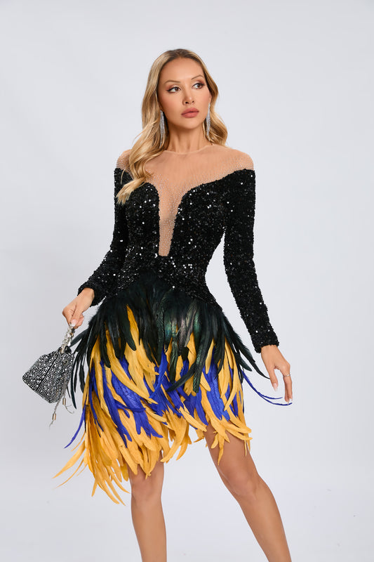 Long Sleeve Feather Detail Sequin Maxi Dress Black HV1799
