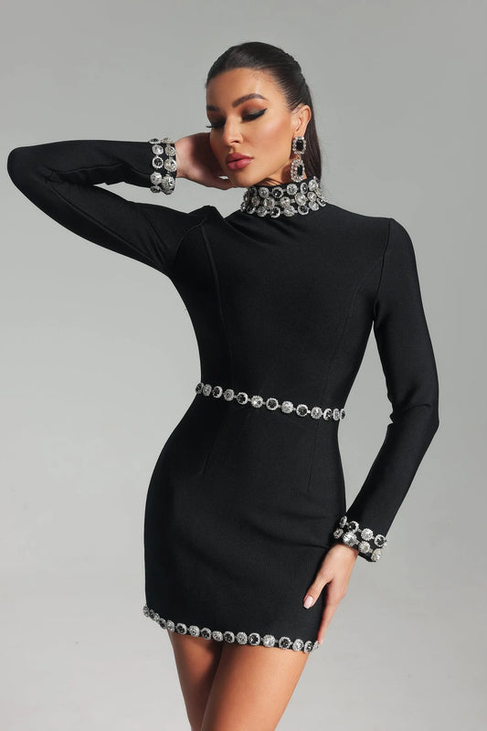 Long Sleeve Crystal Trim Detail Dress Black HV1665