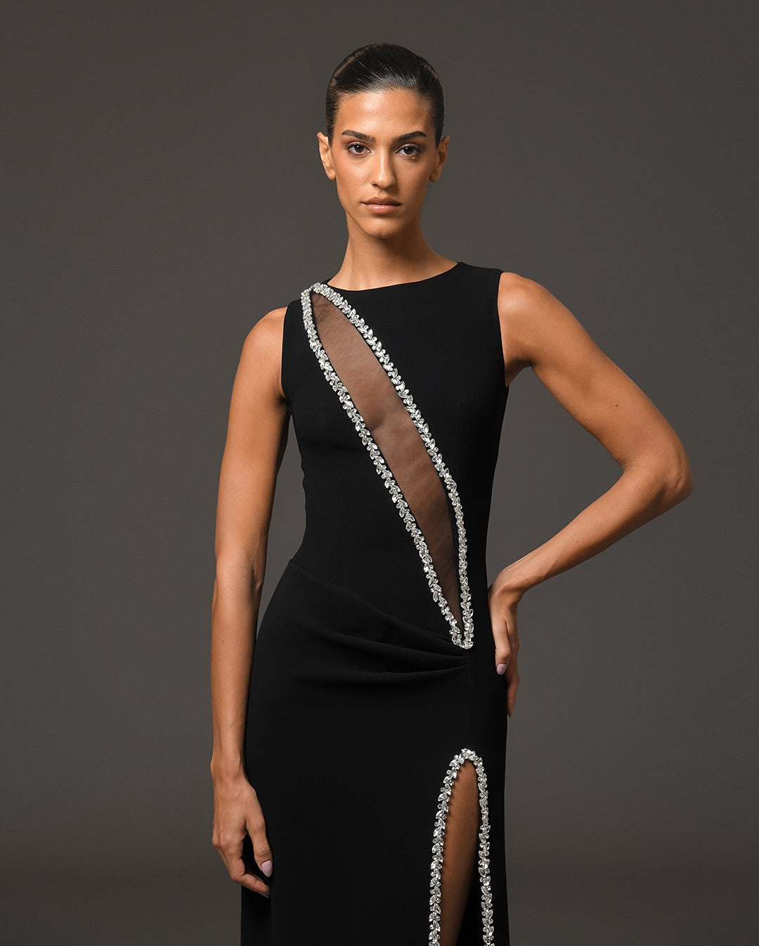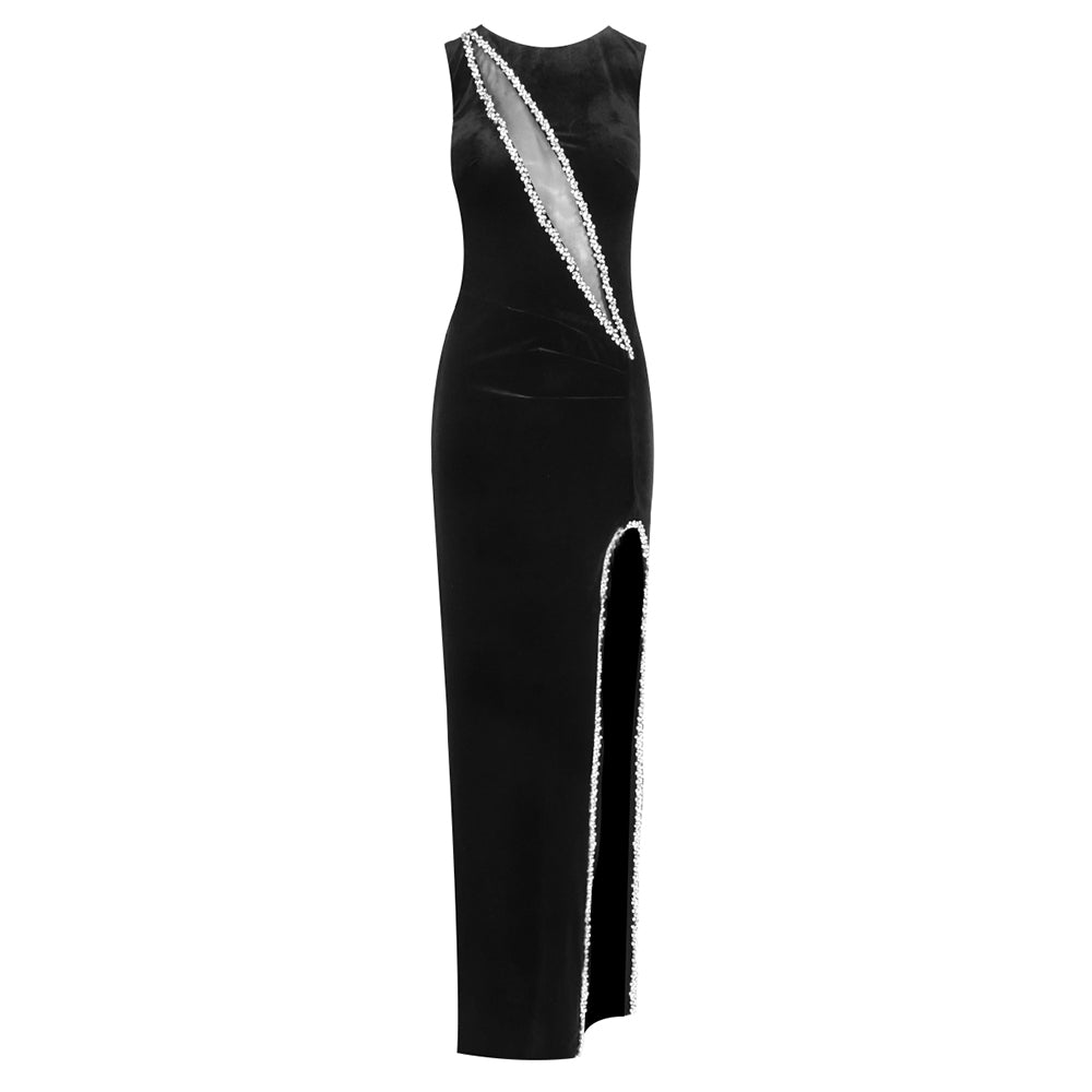 Crystal Mesh Insert Maxi Velvet Dress Black