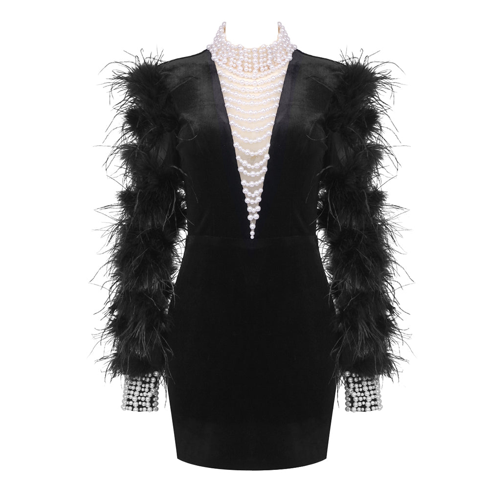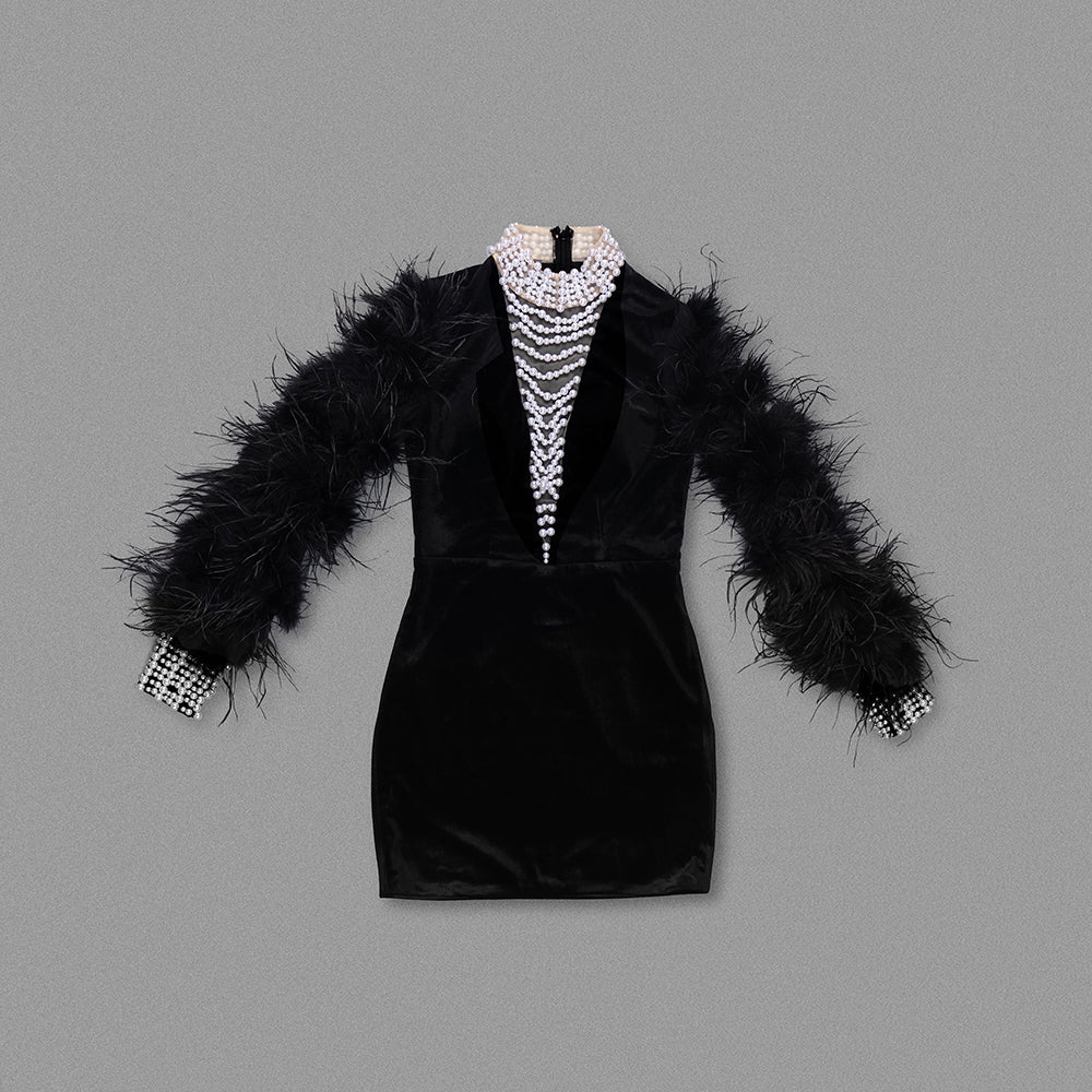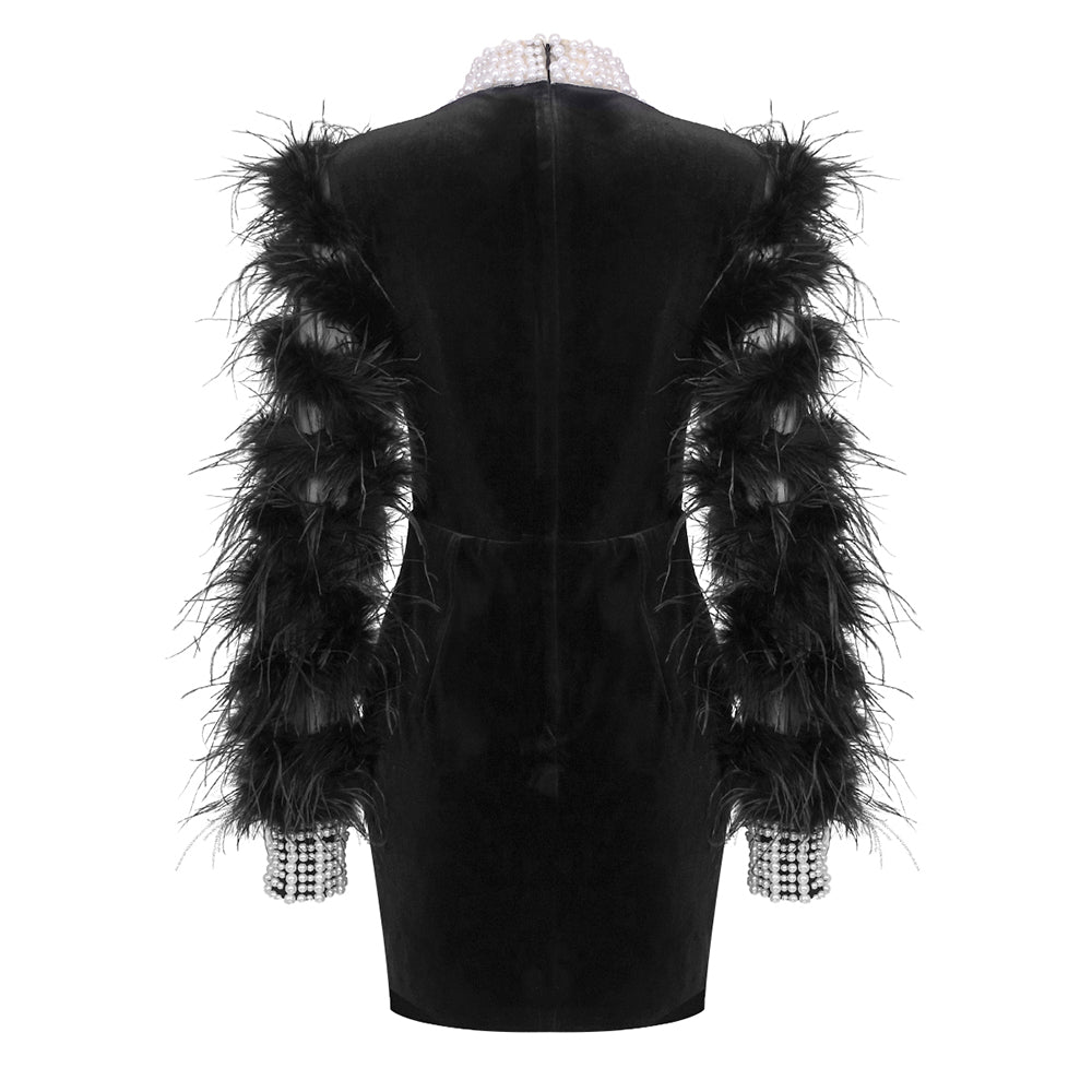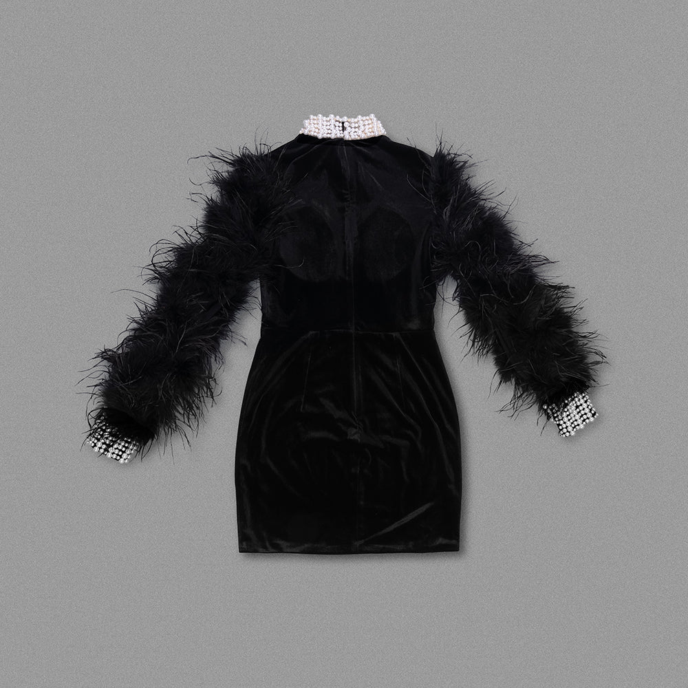 Feather Long Sleeve Pearl Velvet Dress Black HV1322