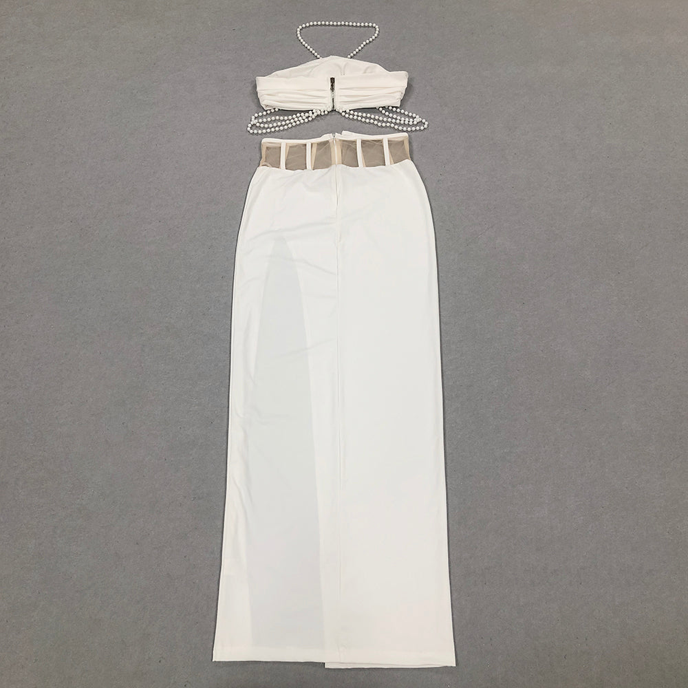 Halter Pearl Bustier Maxi Two Piece Dress White