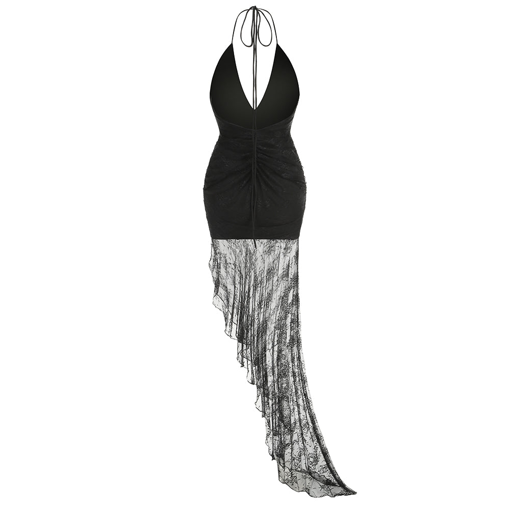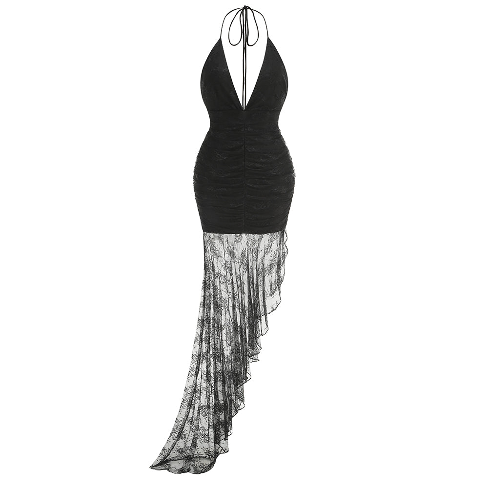Halter Ruched Lace Ruffle Maxi Dress HV1482