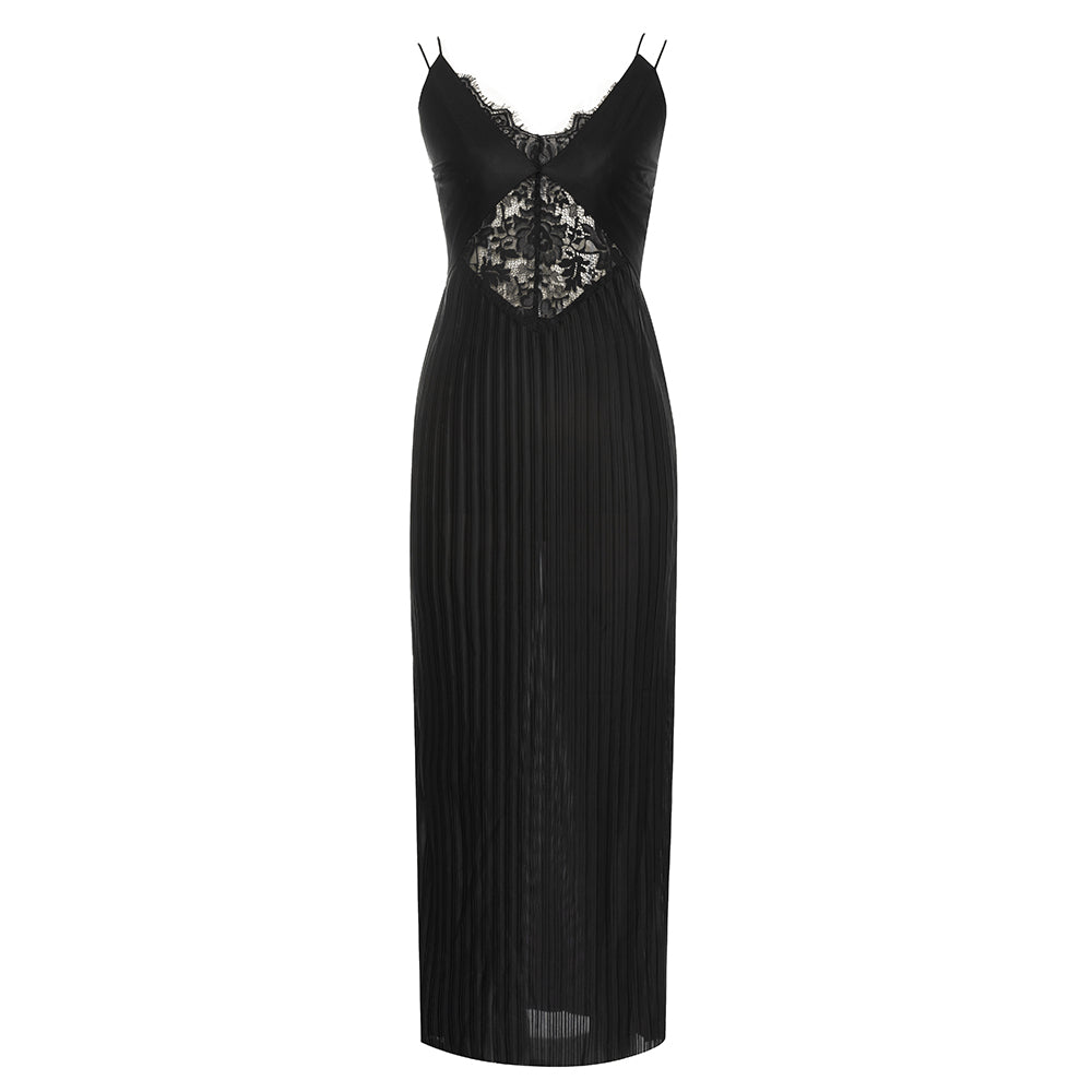 Lace Insert Pleated Maxi Dress Black HV9823
