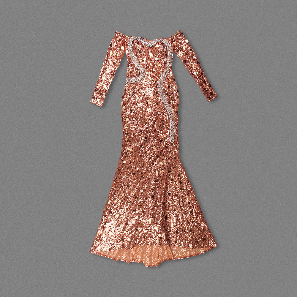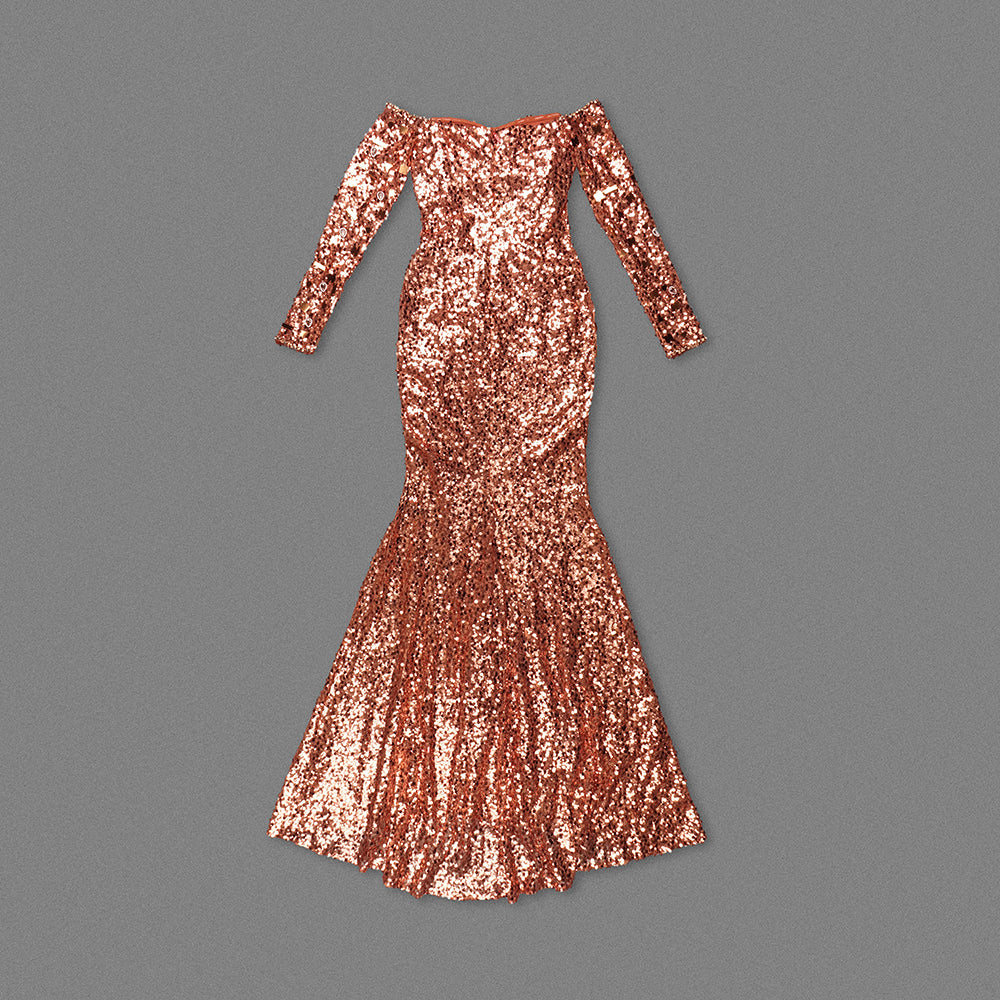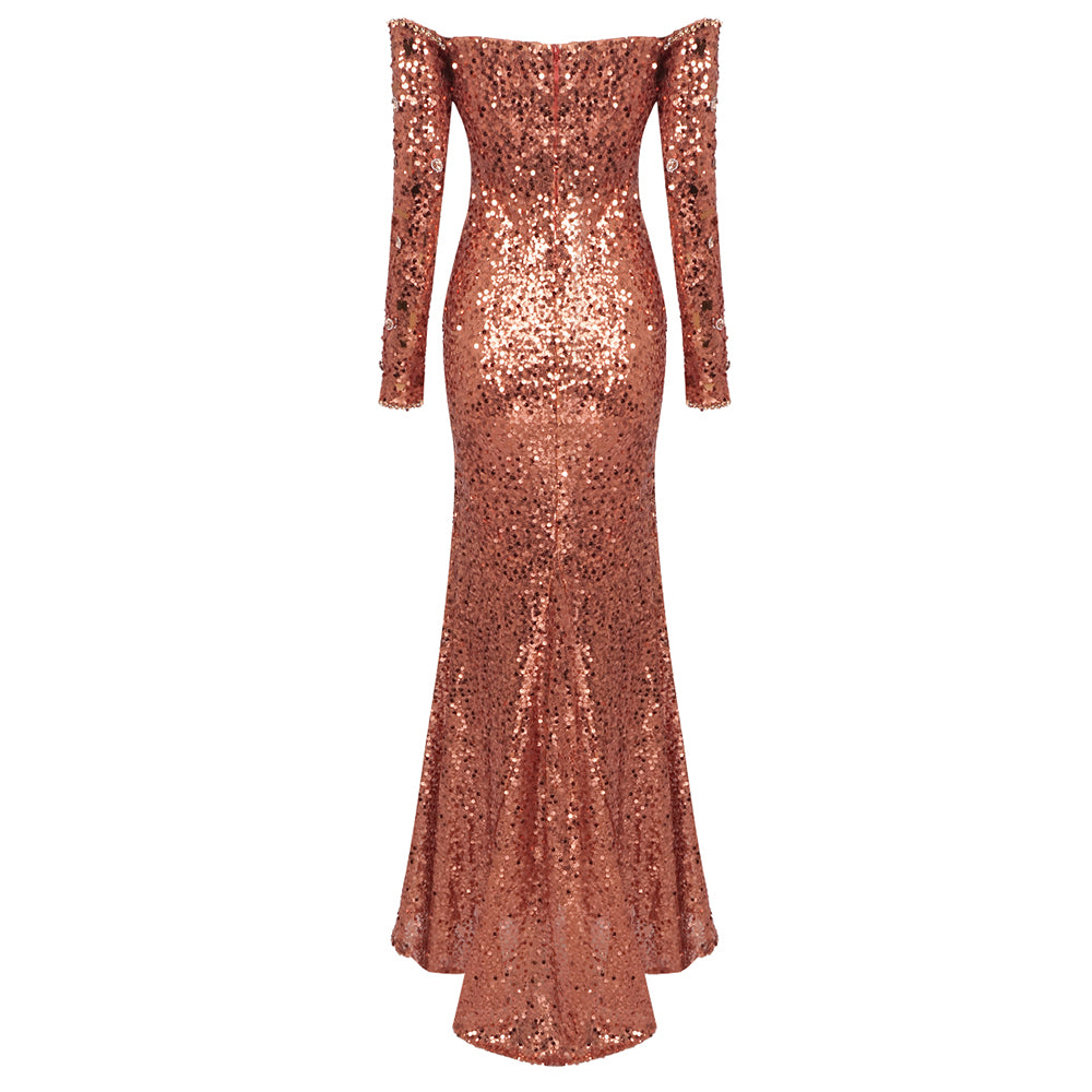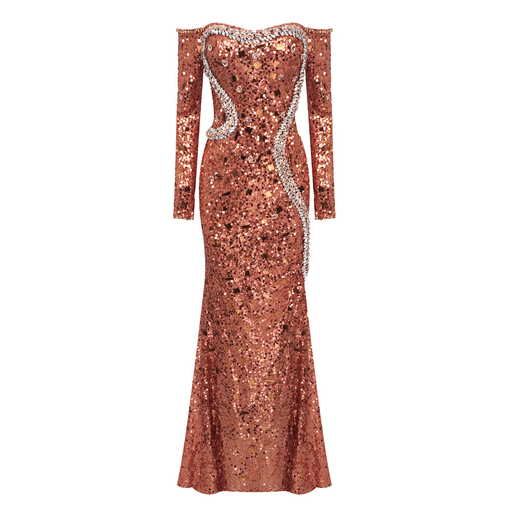 Long Sleeve Bardot Sequin Crystal Maxi Dress Rust