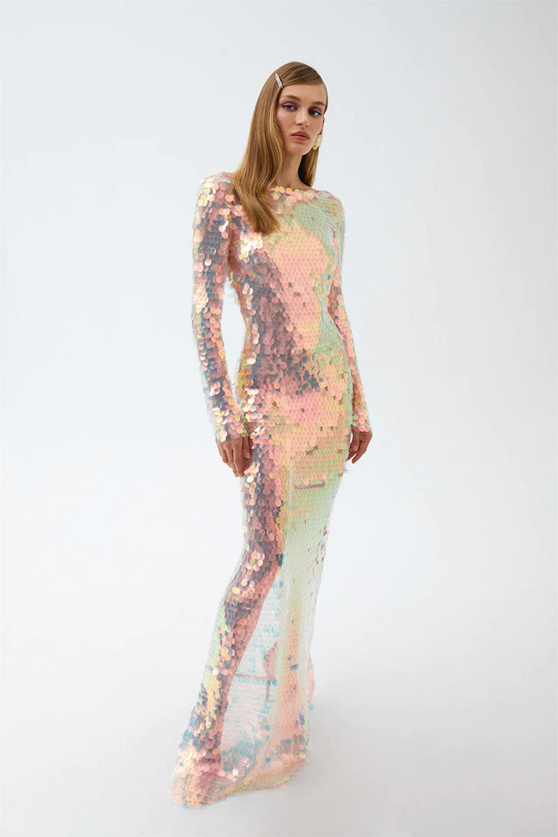 Long Sleeve Big Sequins Backless Maxi Dress Duochrome