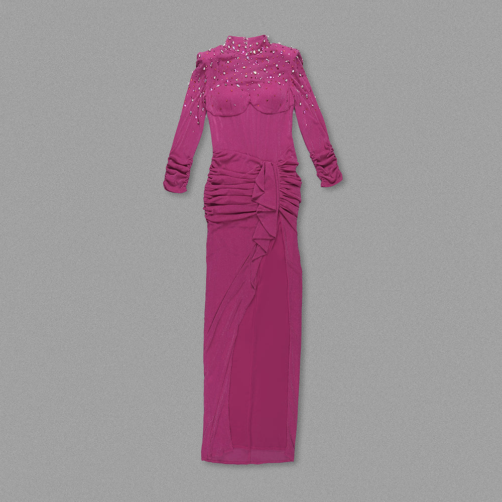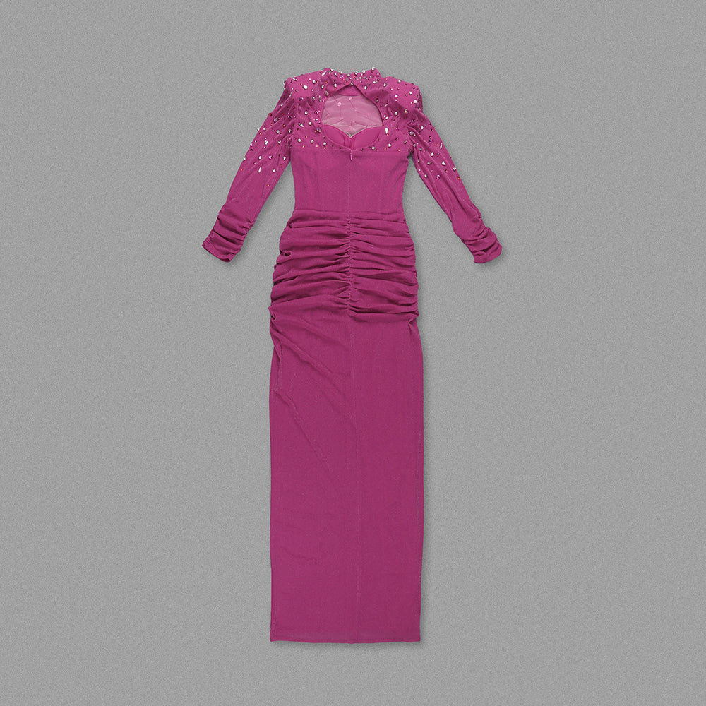 Long Sleeve Crystal Corset Draped Maxi Dress Hot Pink