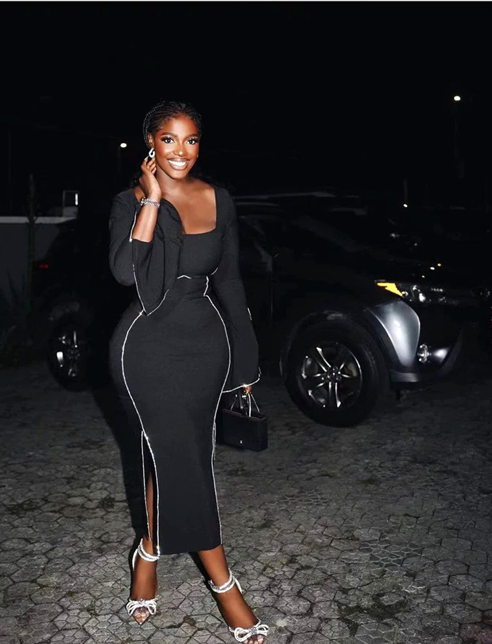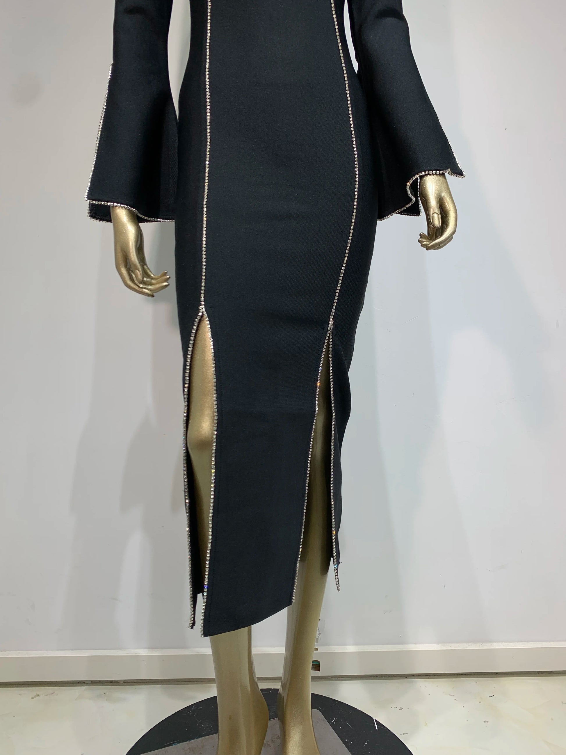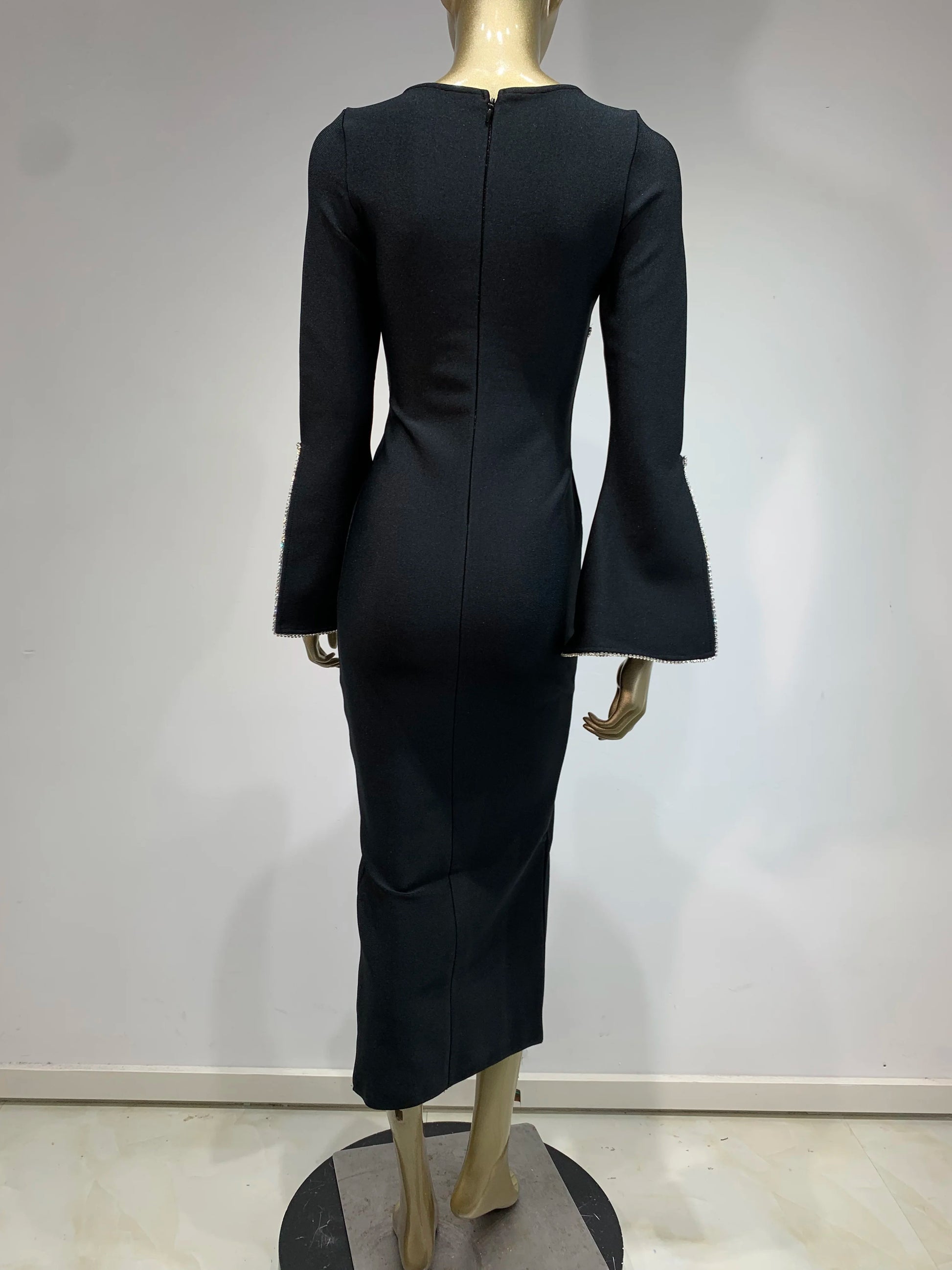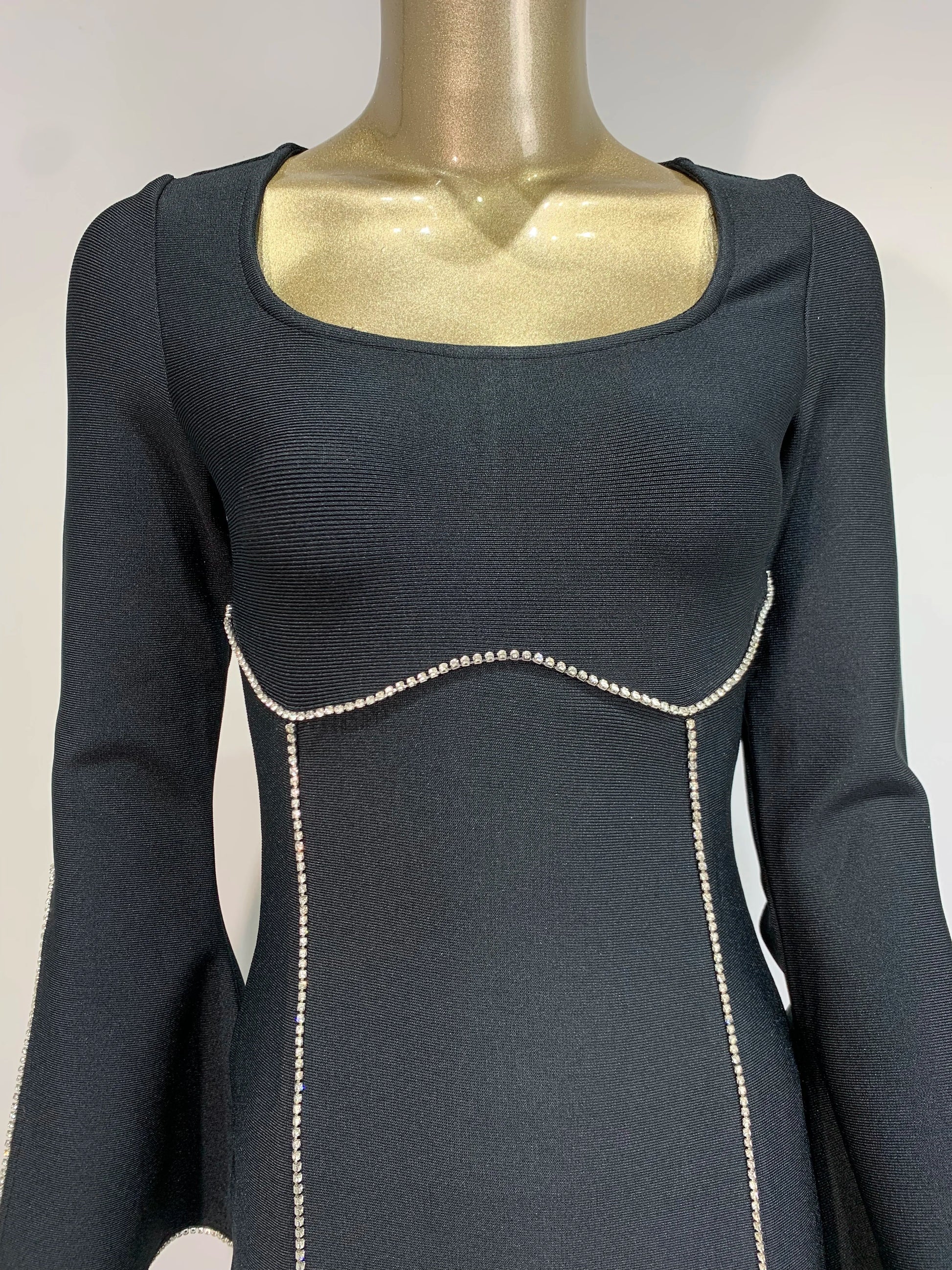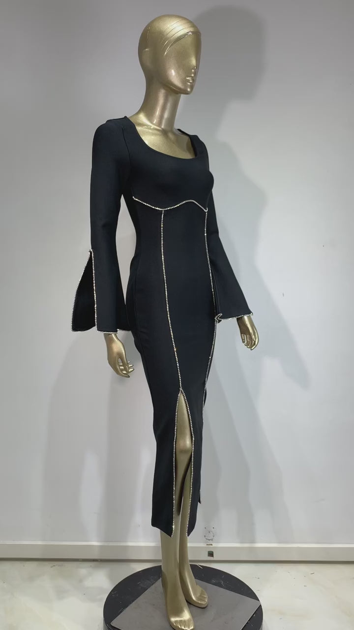 Long Sleeve Crystal Trim Midi Dress Black