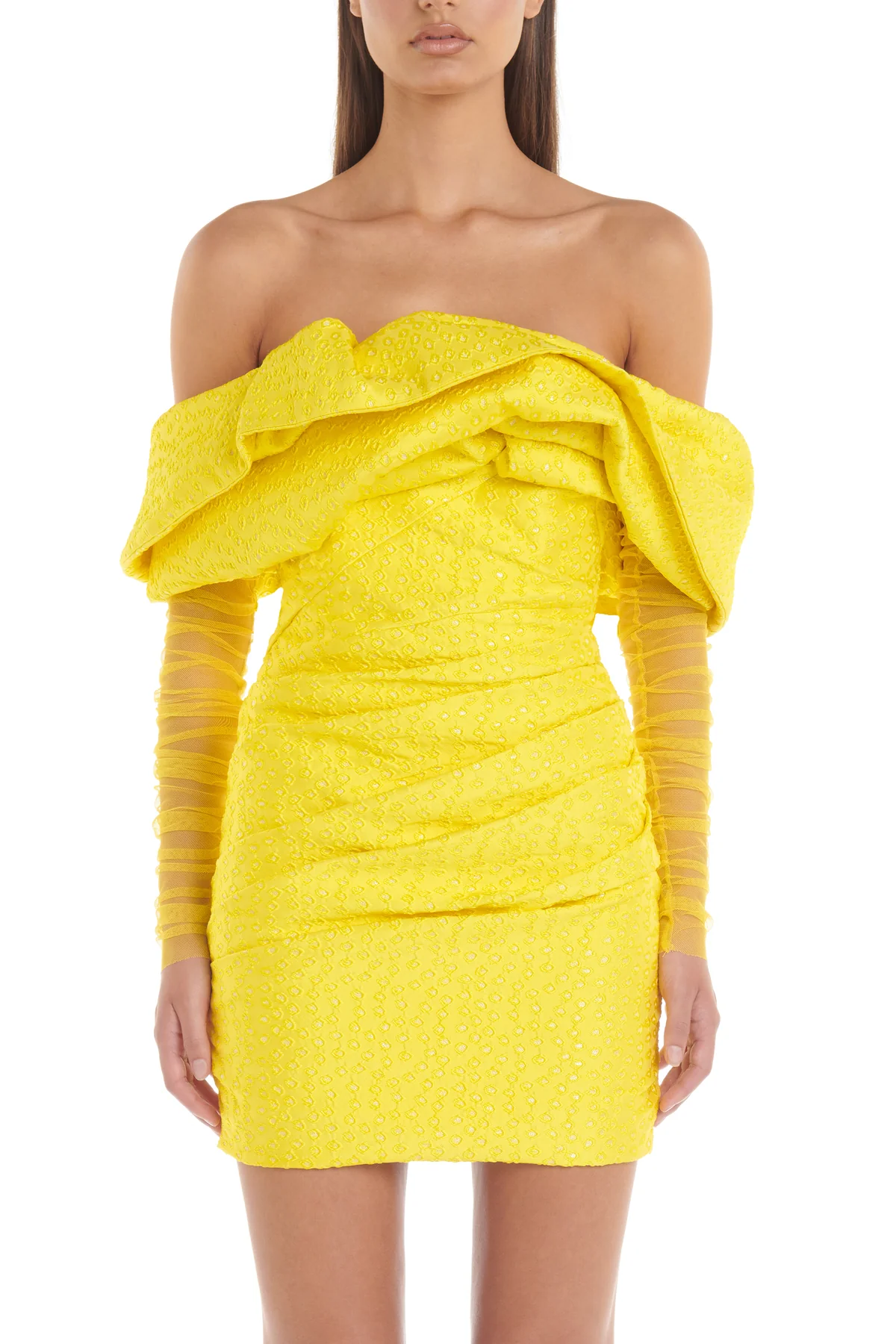 Long Sleeve Draped Off Shoulder Sparkly Dress Yellow