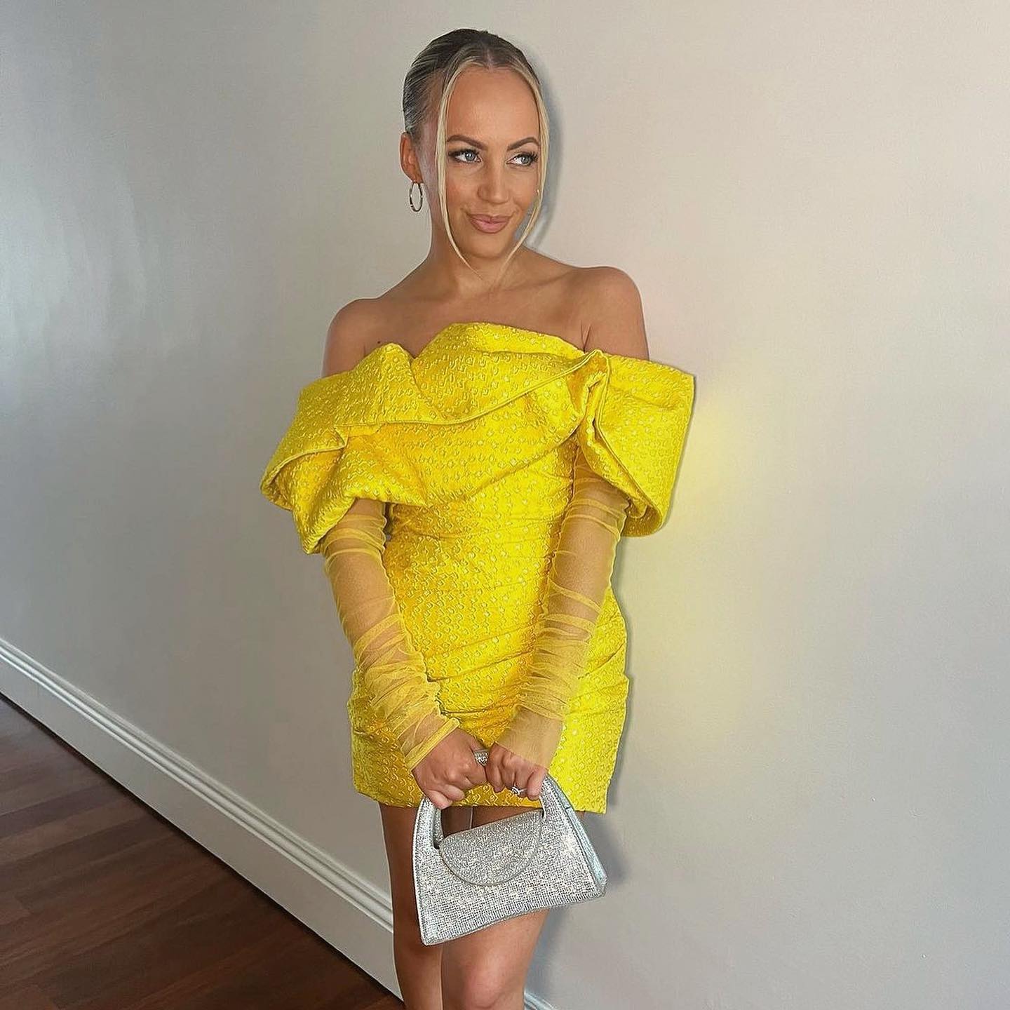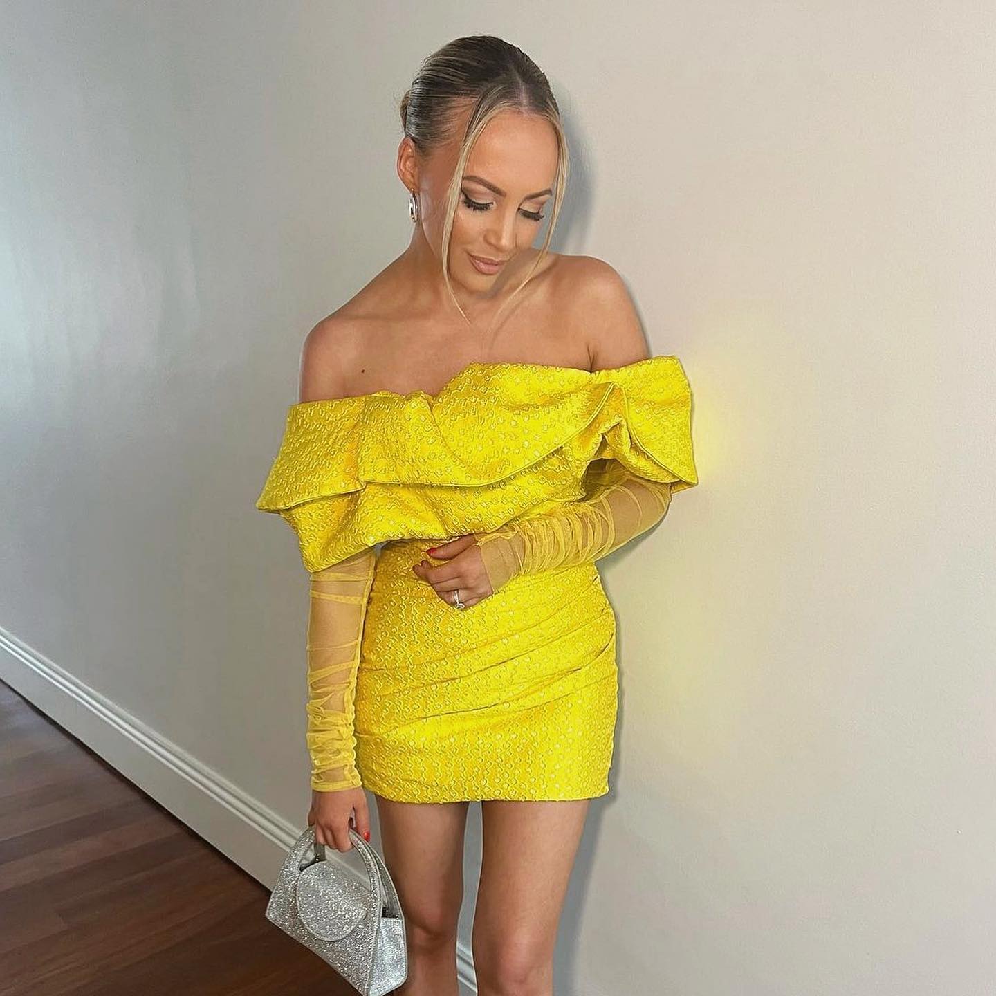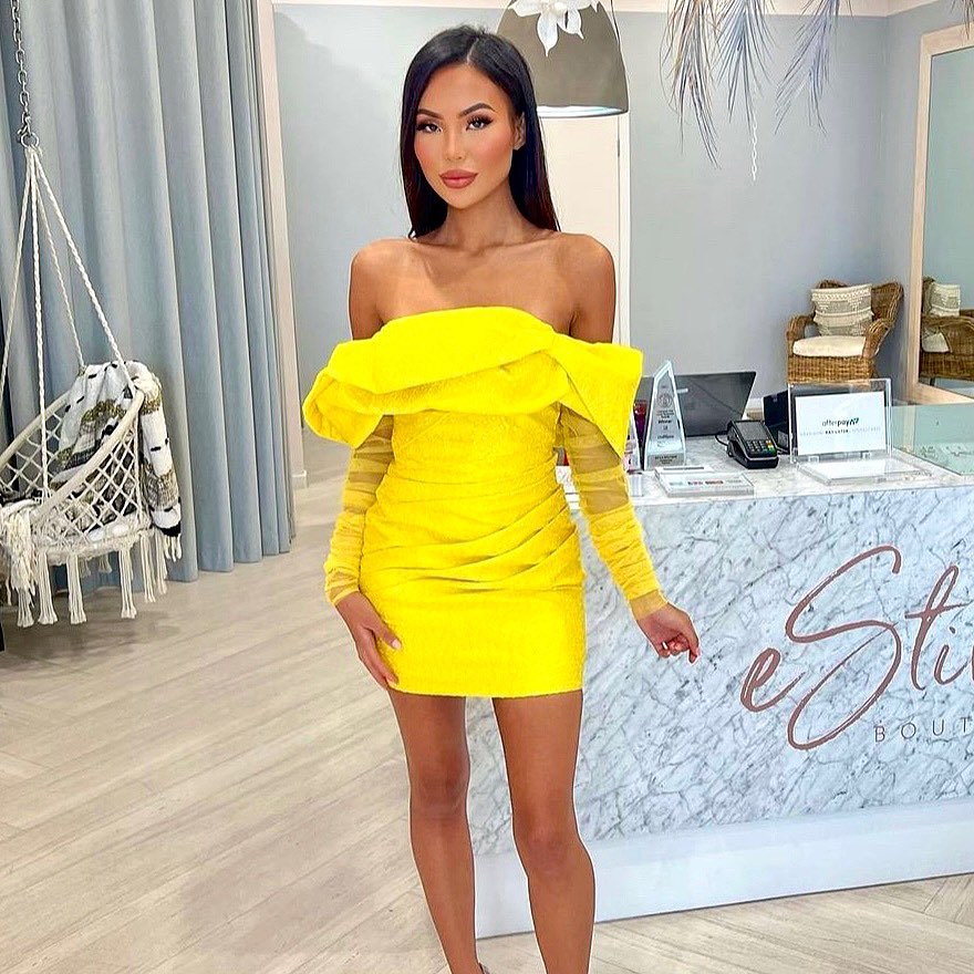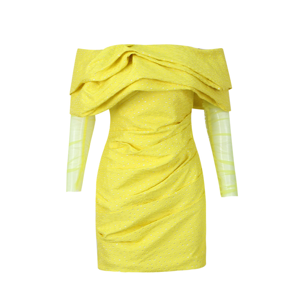 Long Sleeve Draped Off Shoulder Sparkly Dress Yellow HV9878