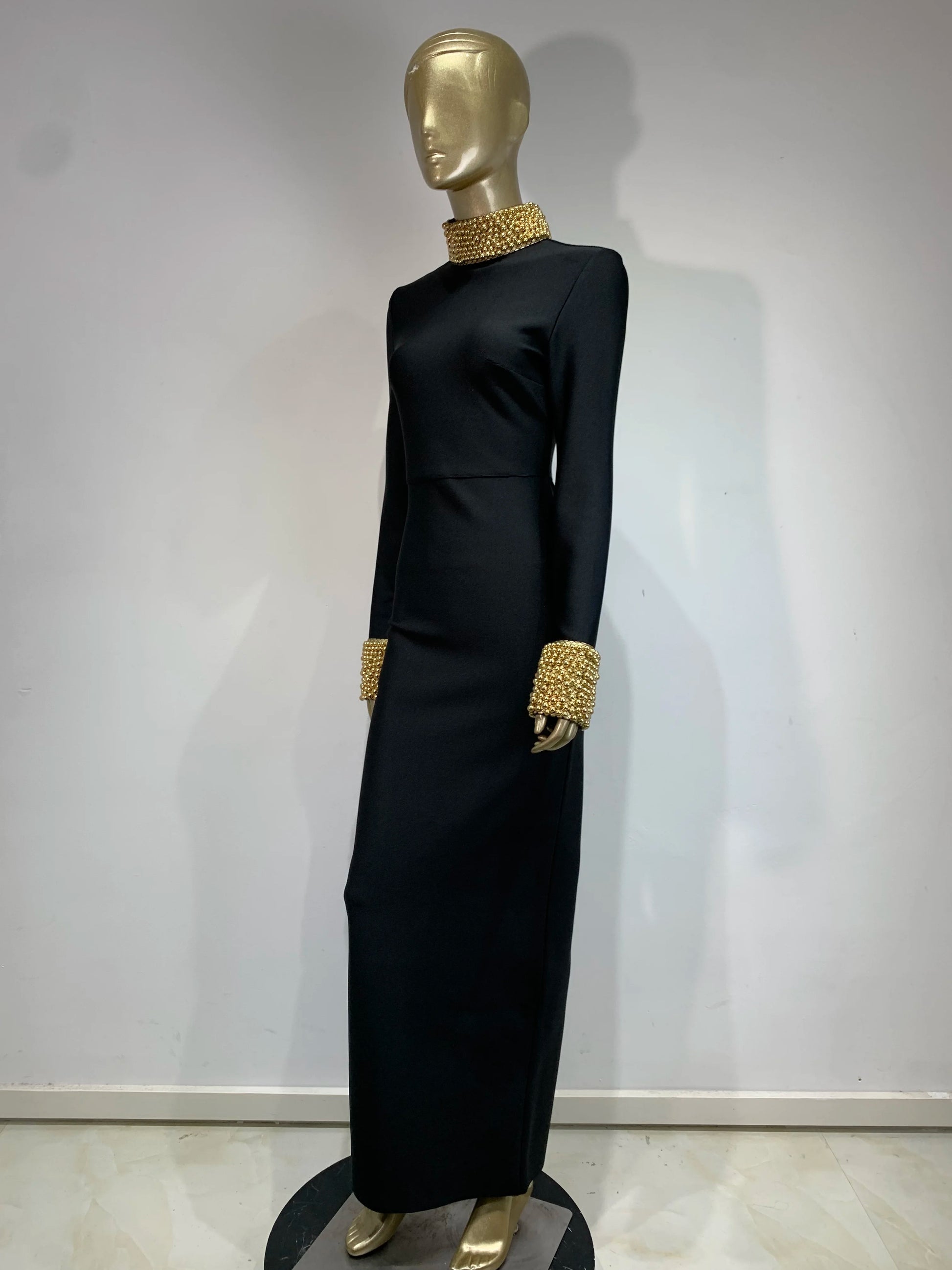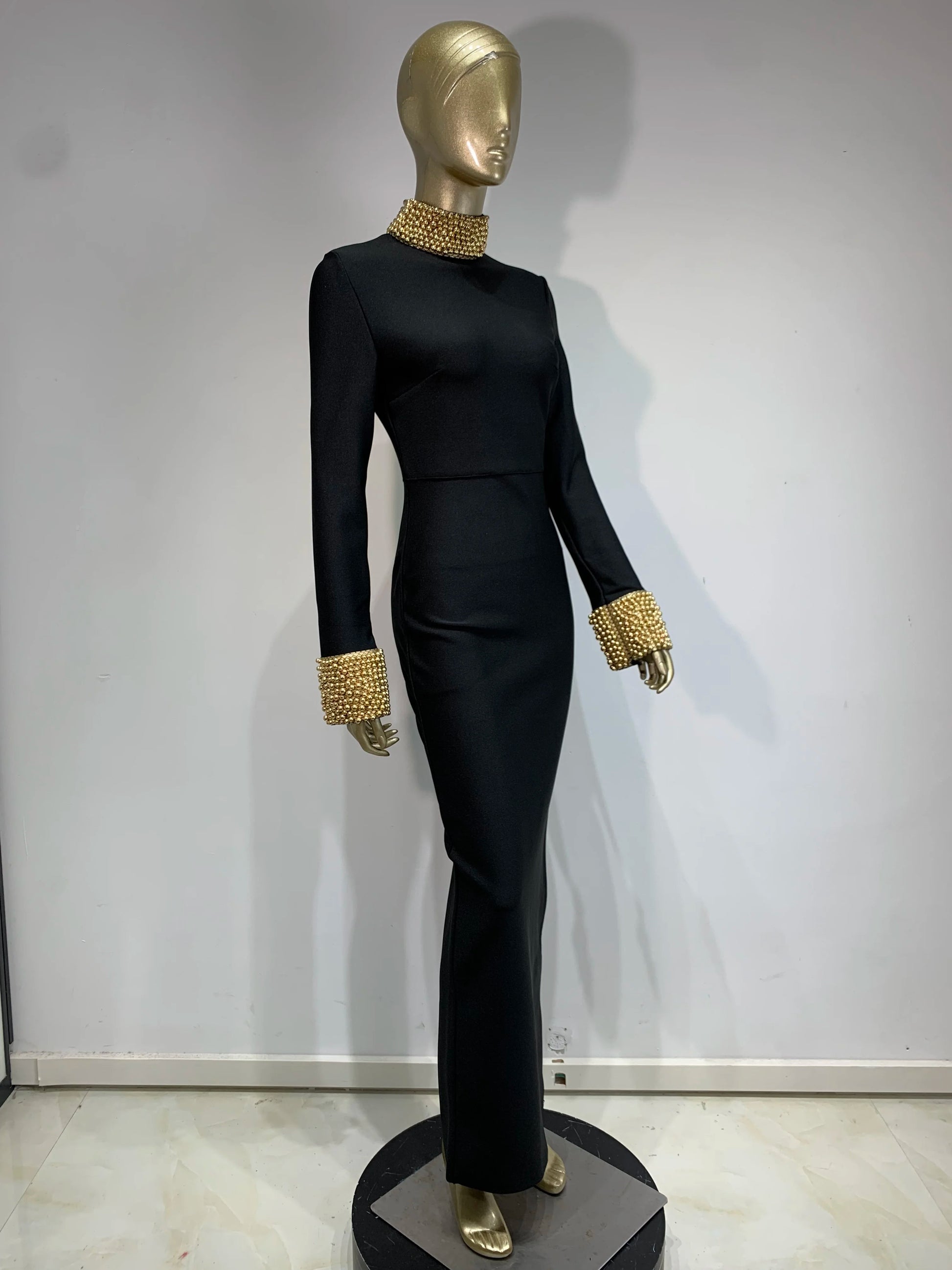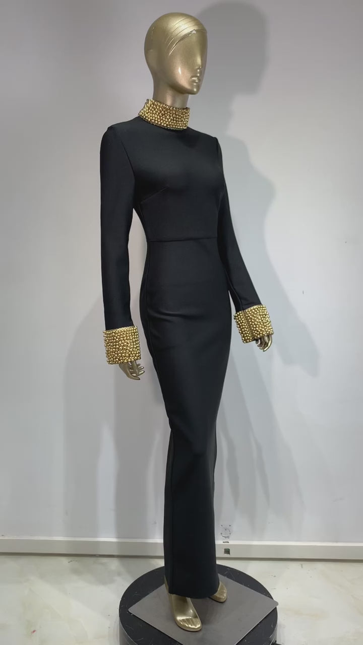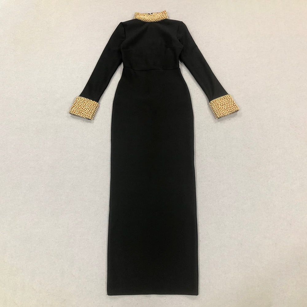 Long Sleeve Embellished Backless Maxi Dress Black HV1739