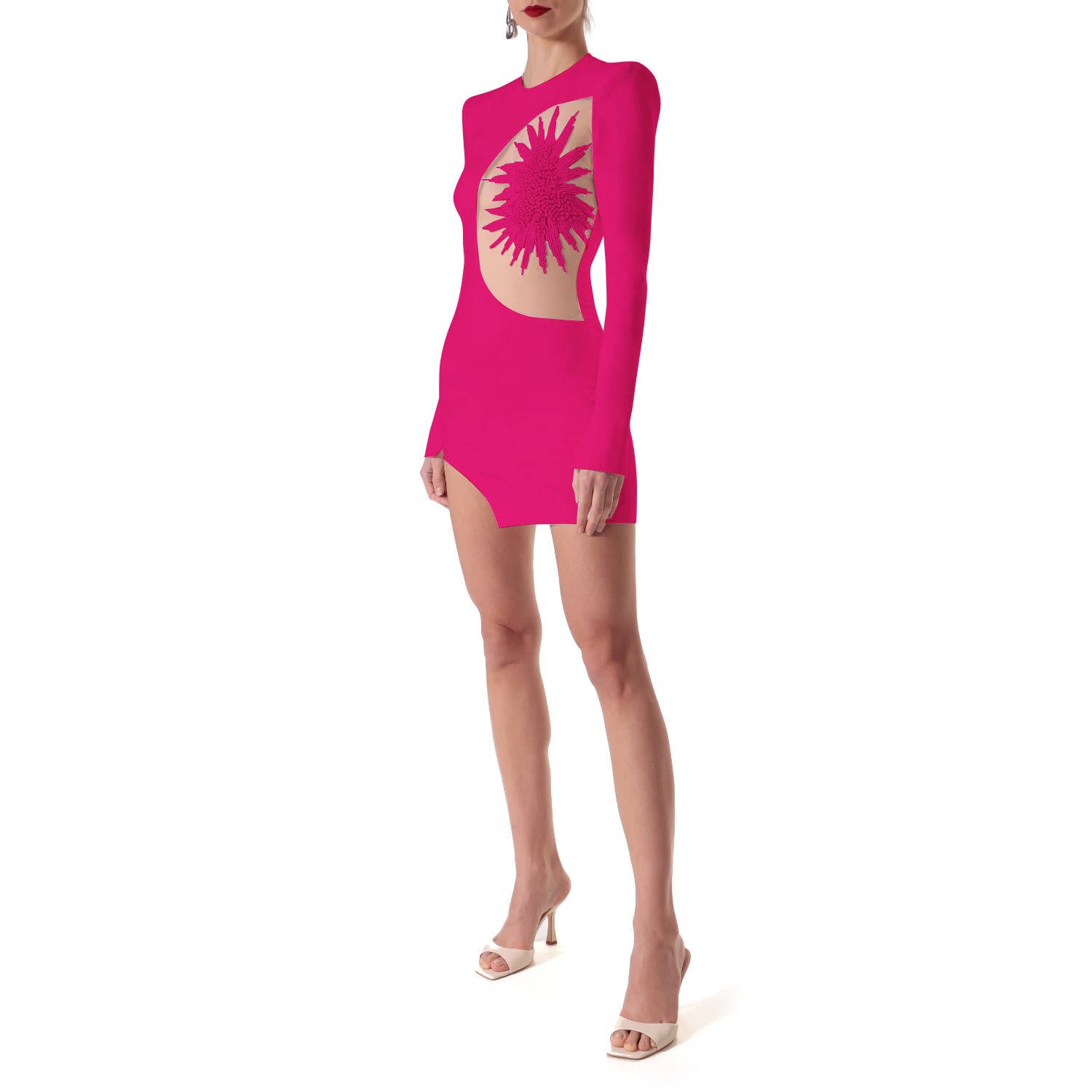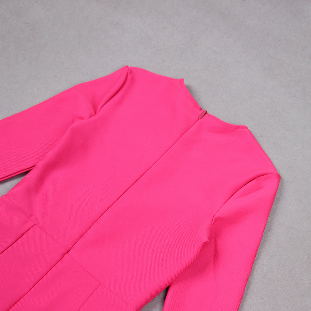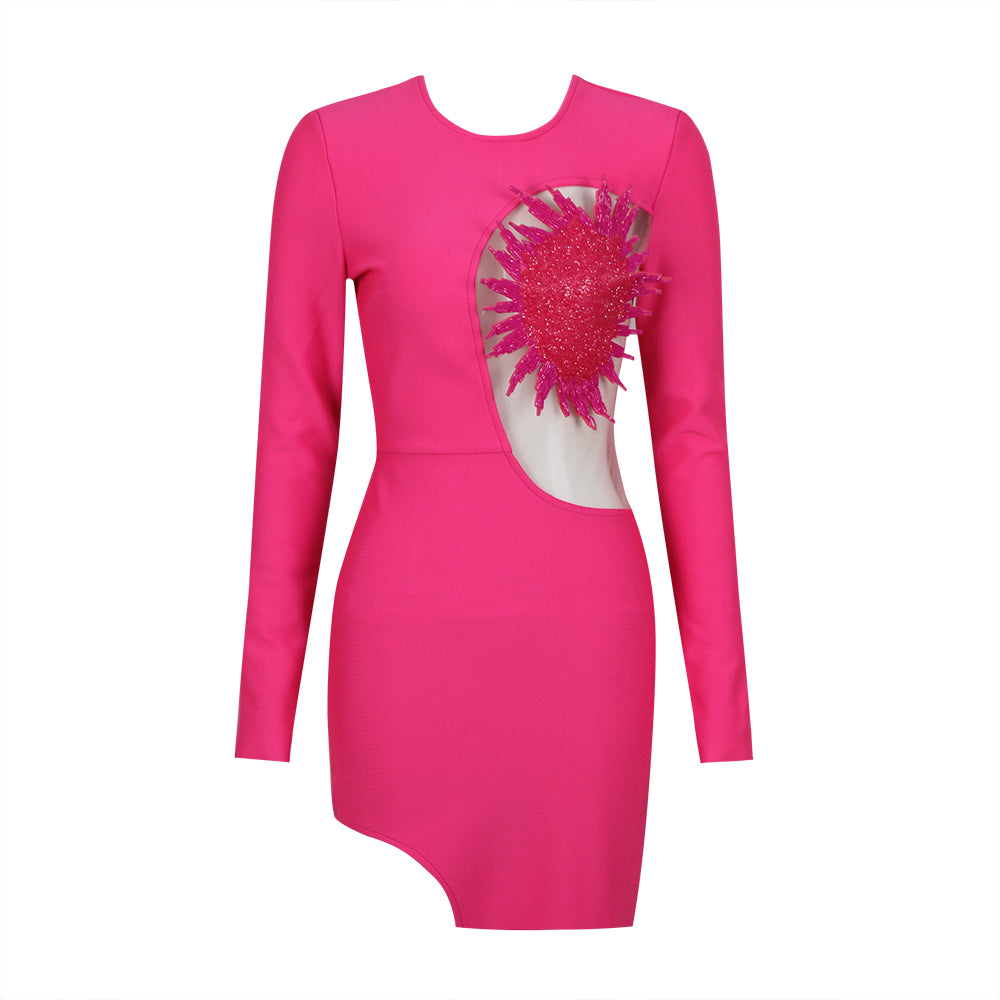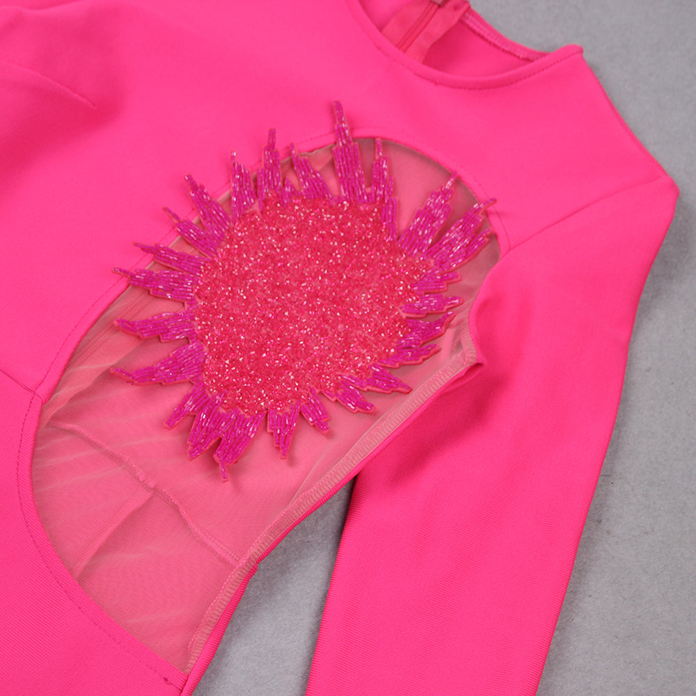 Long Sleeve Embellished Mesh Dress Hot Pink