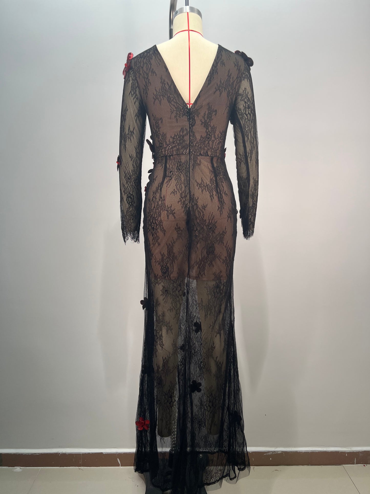 Long Sleeve Floral Detail Lace Maxi Dress Black Red