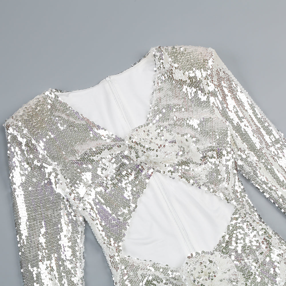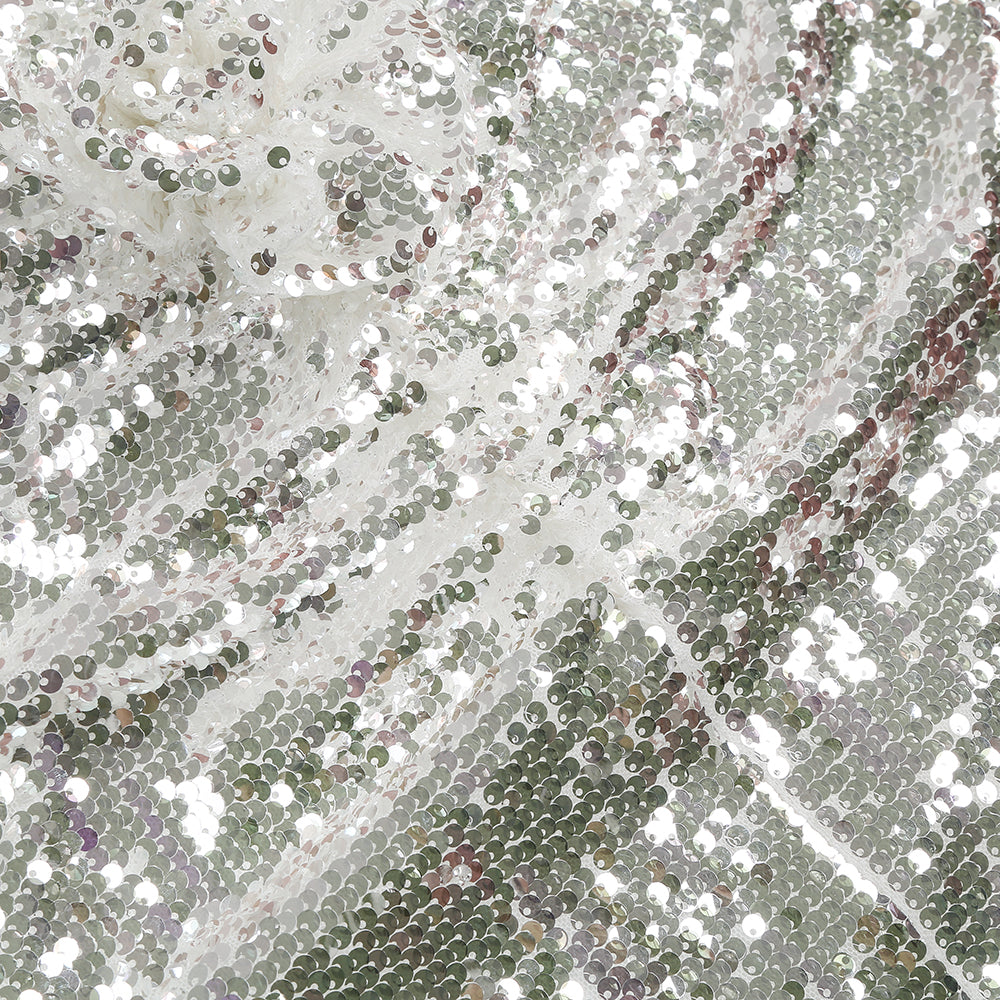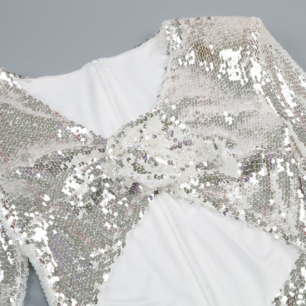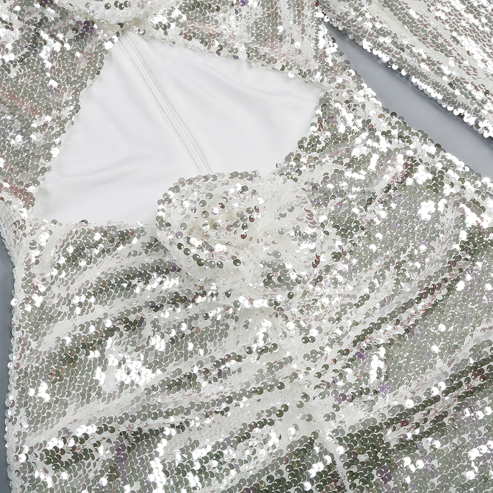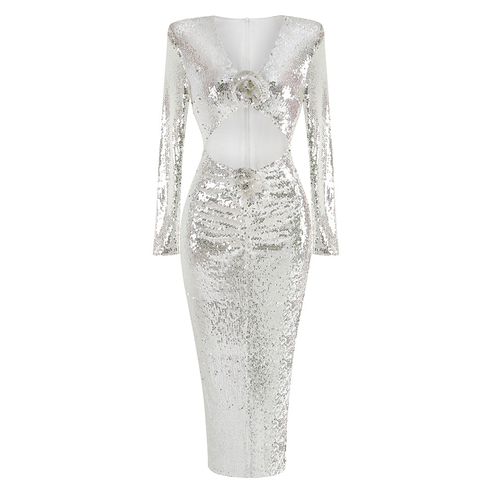 Long Sleeve Flower Detail Sequin Midi Dress White