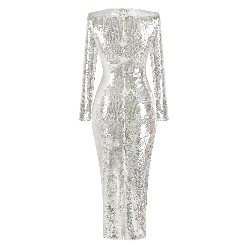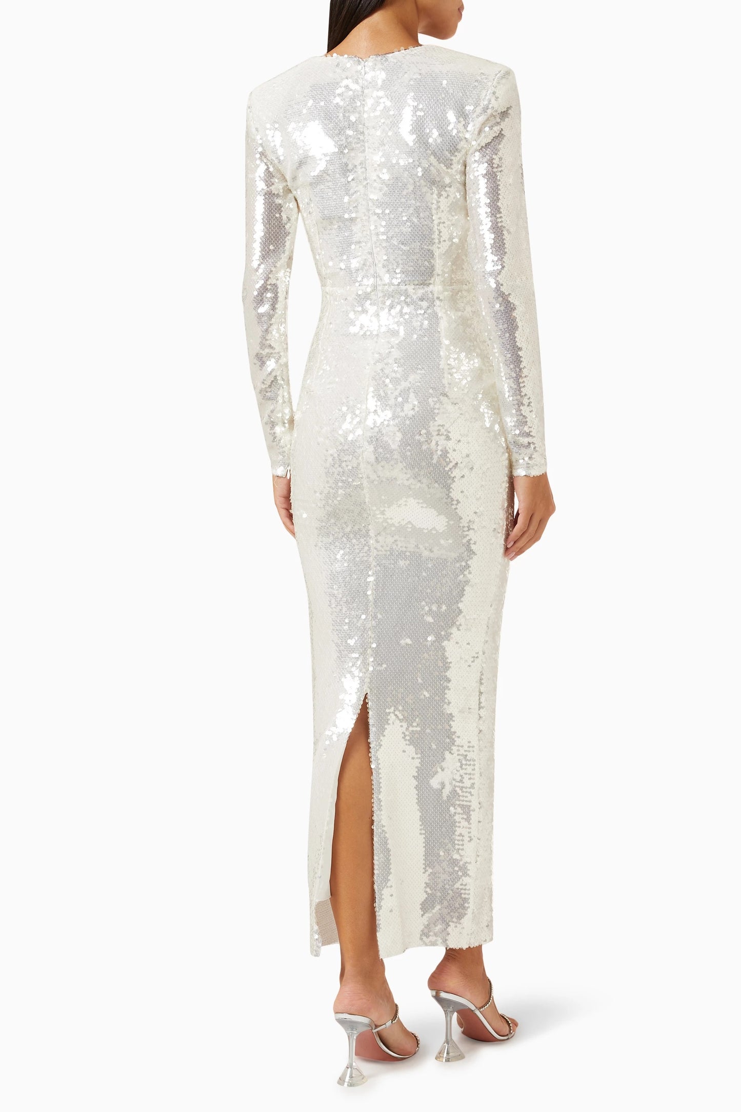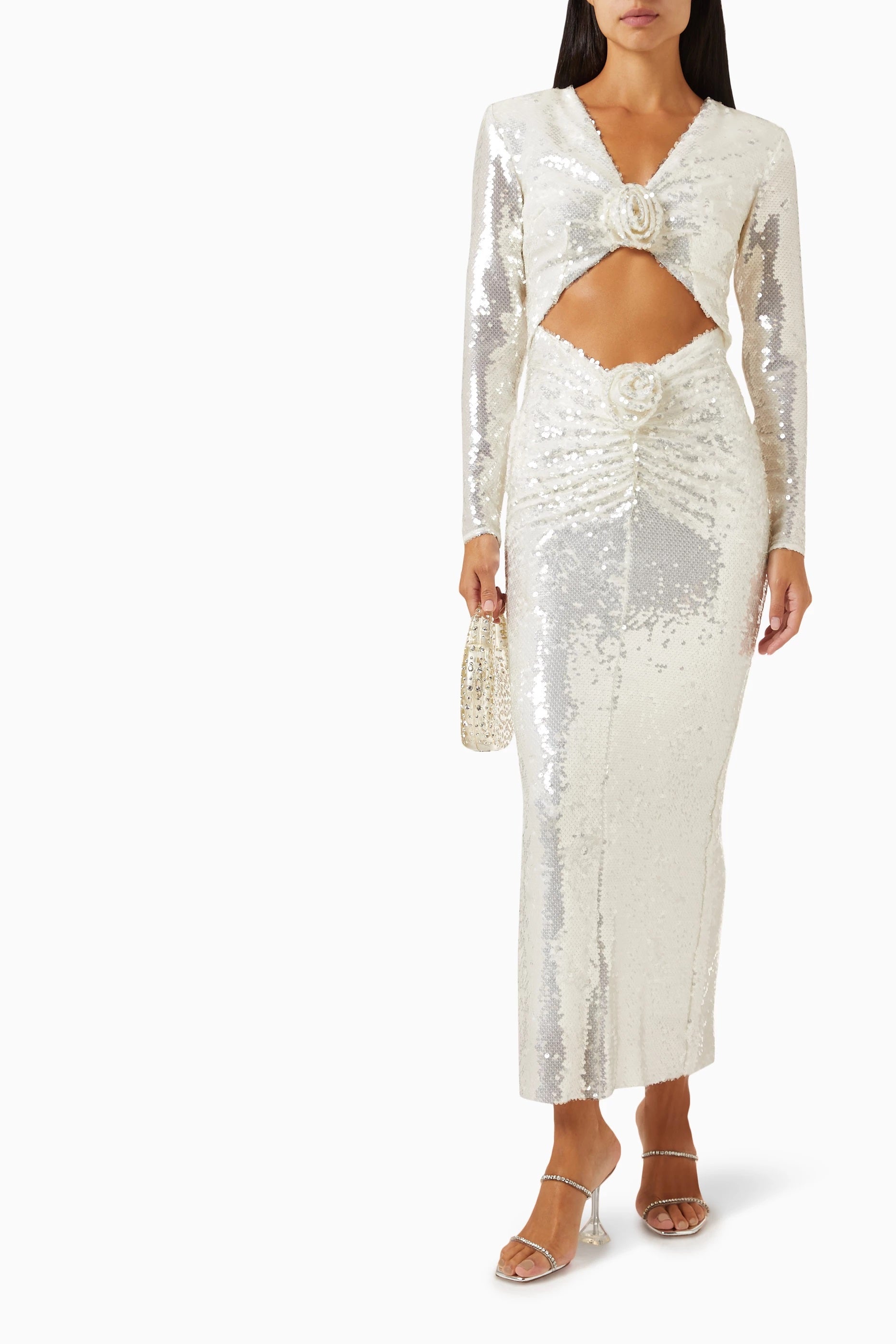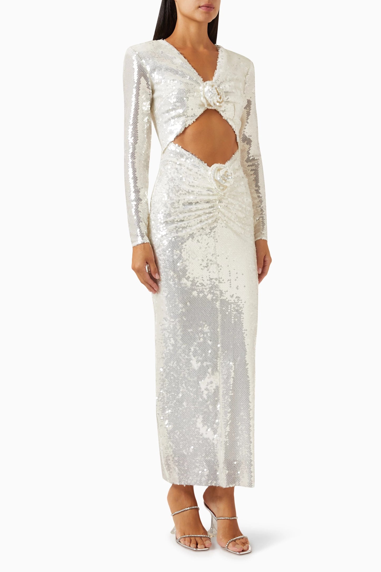 ong Sleeve Flower Detail Sequin Midi Dress White