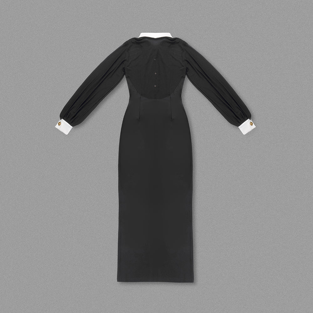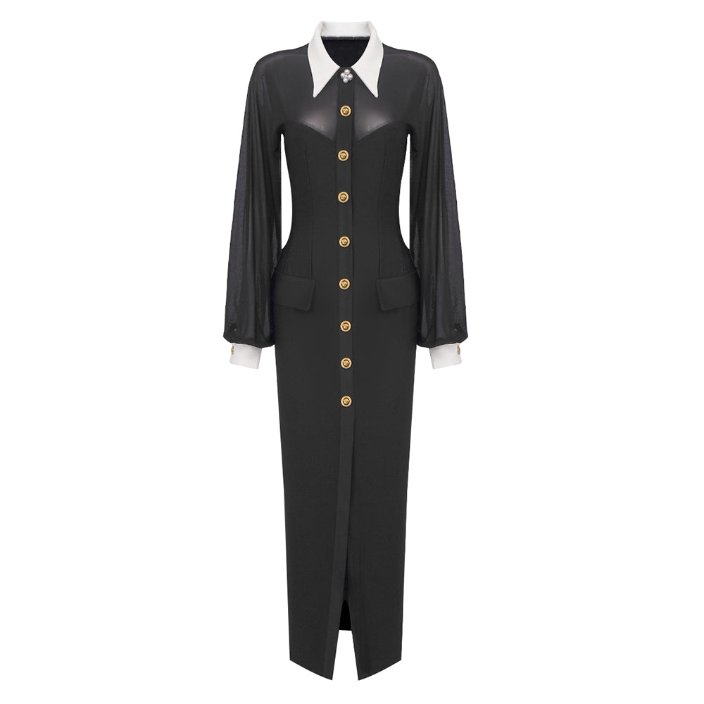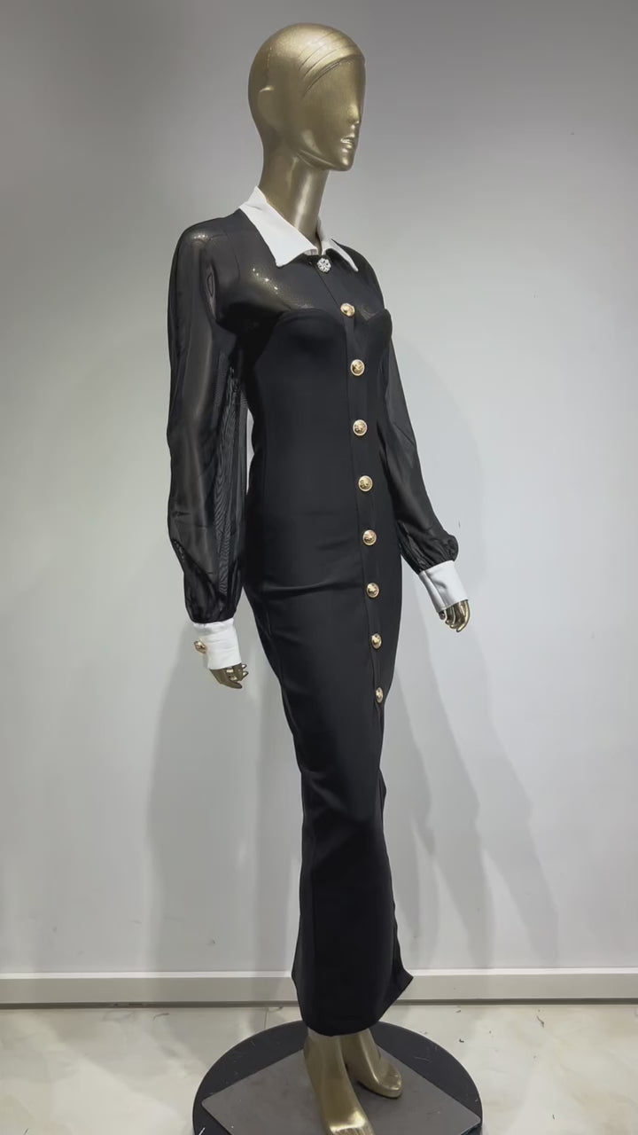 Long Sleeve Mesh Button Maxi Dress Black HV1263