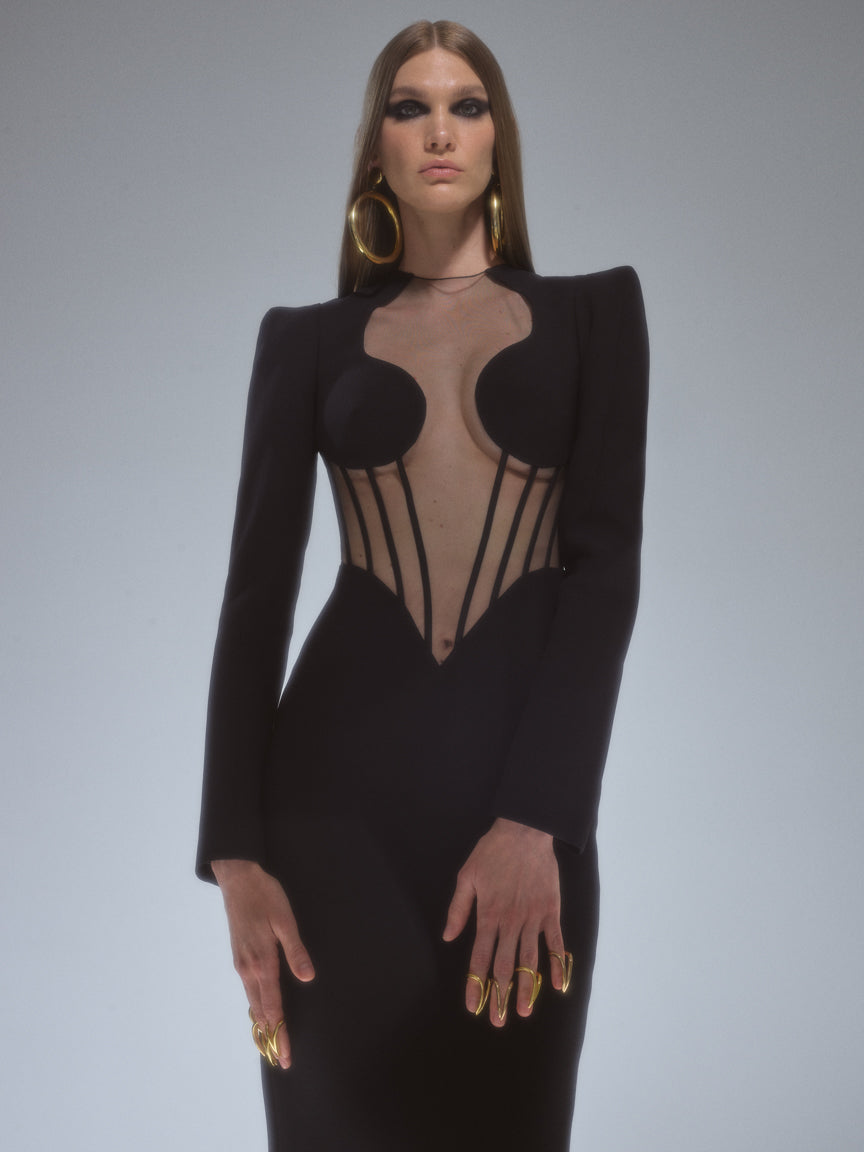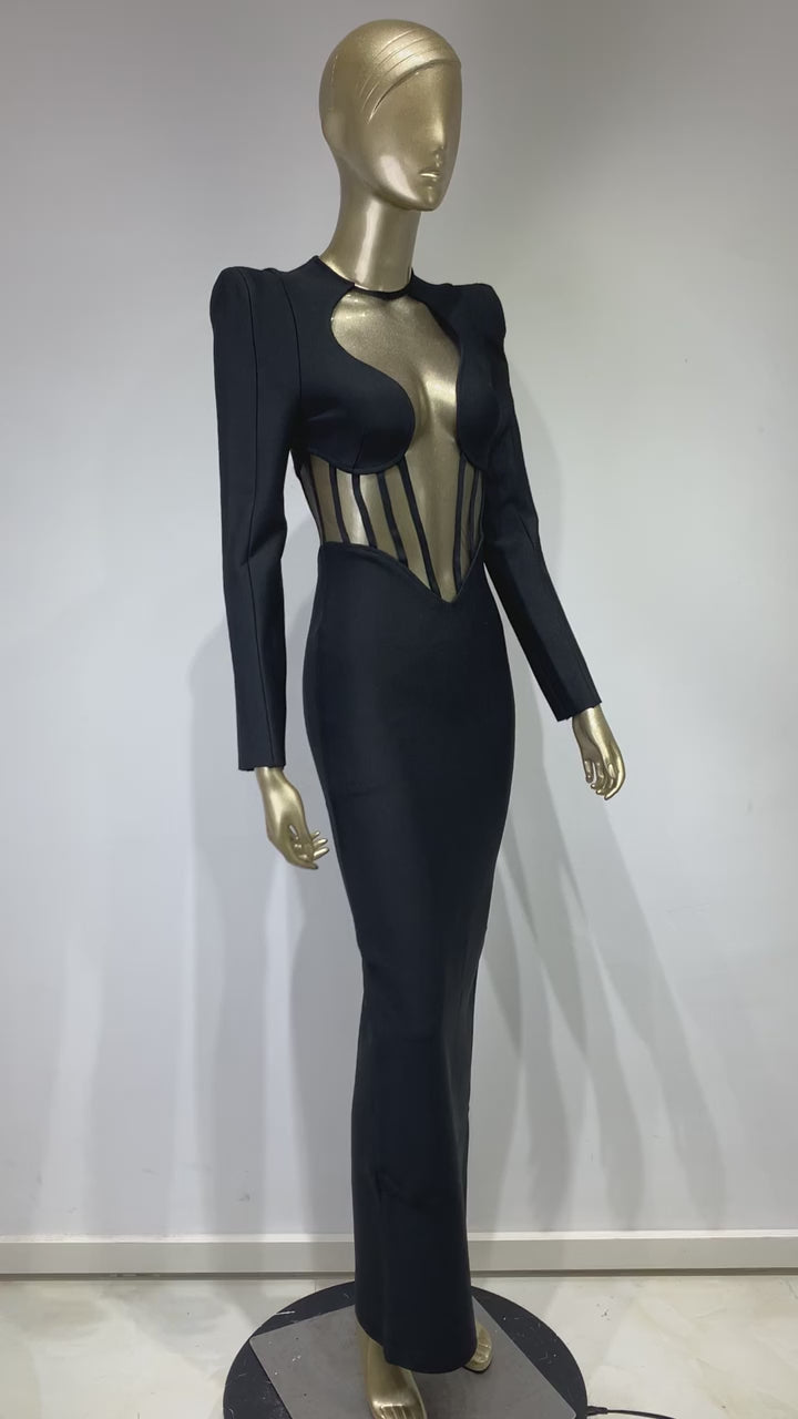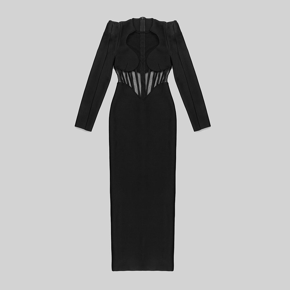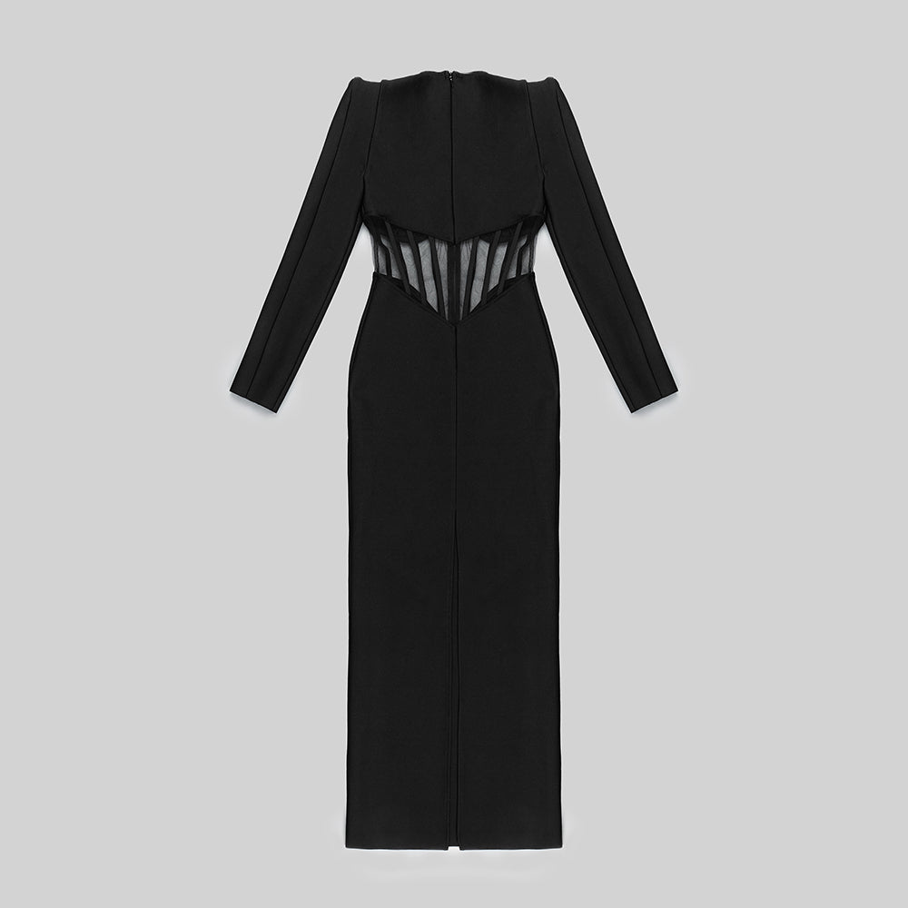 Long Sleeve Mesh Insert Maxi Dress Black