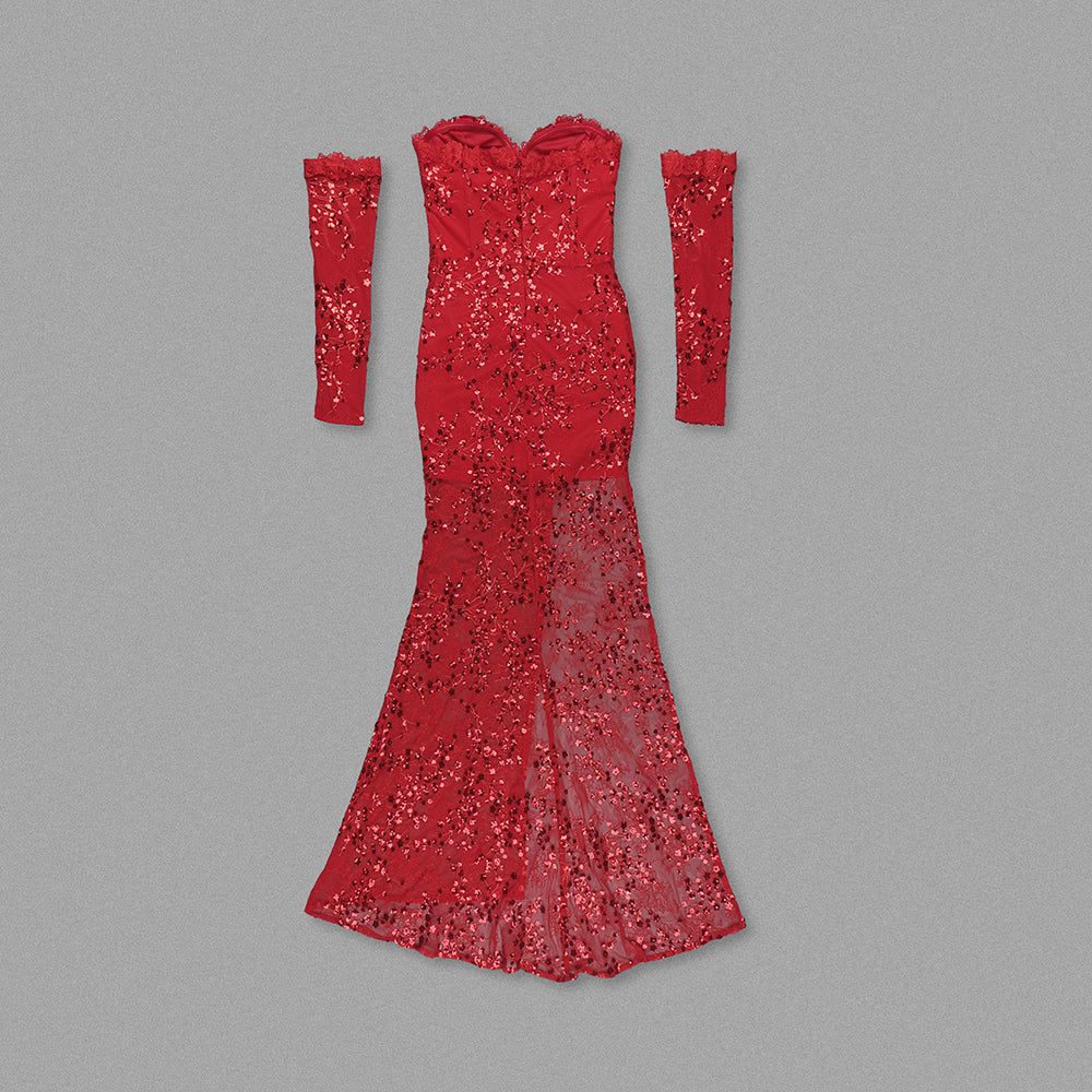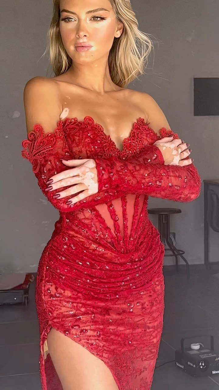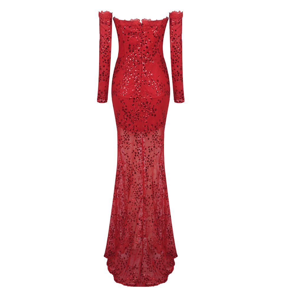 Long Sleeve Sequin Lace Corset Maxi Dress Red