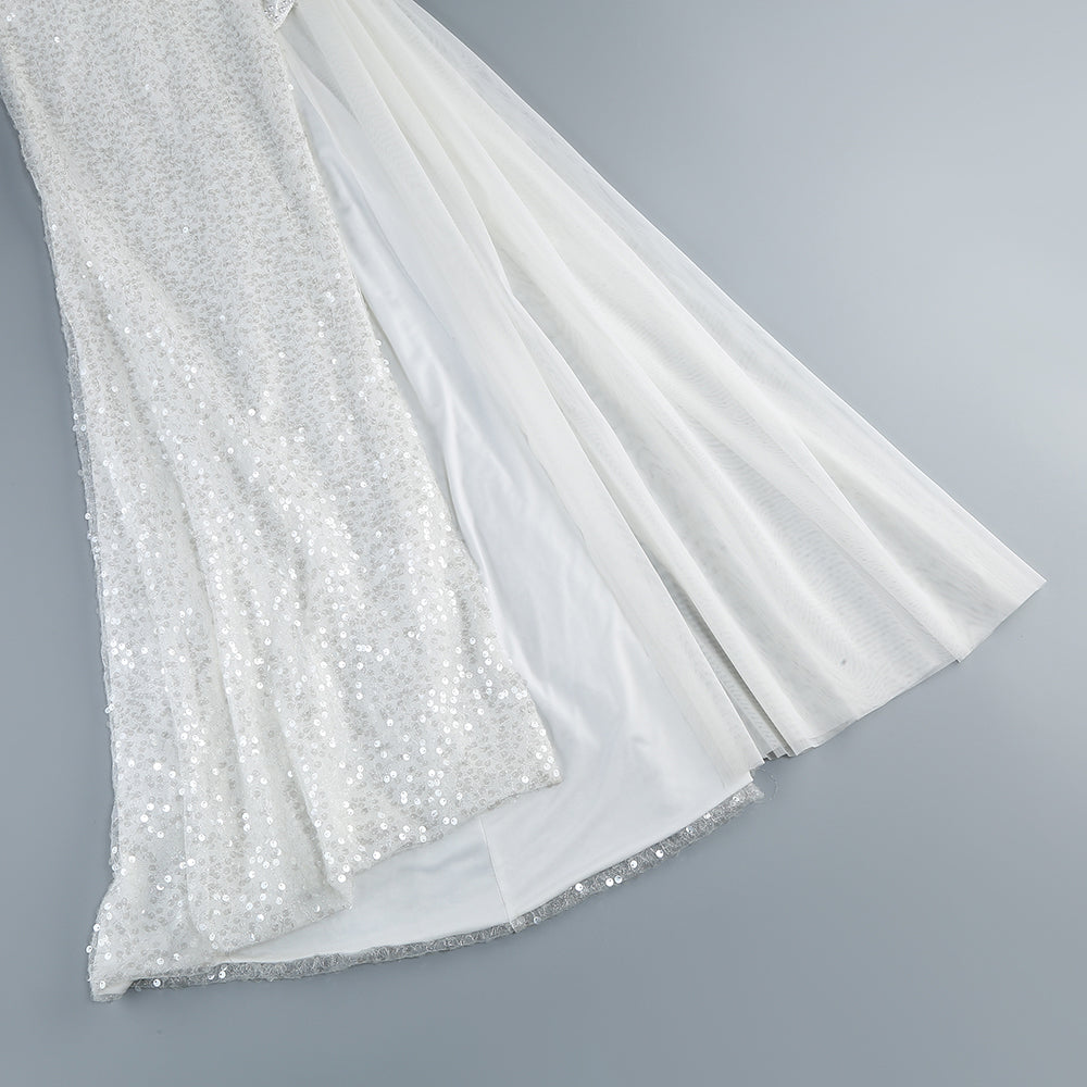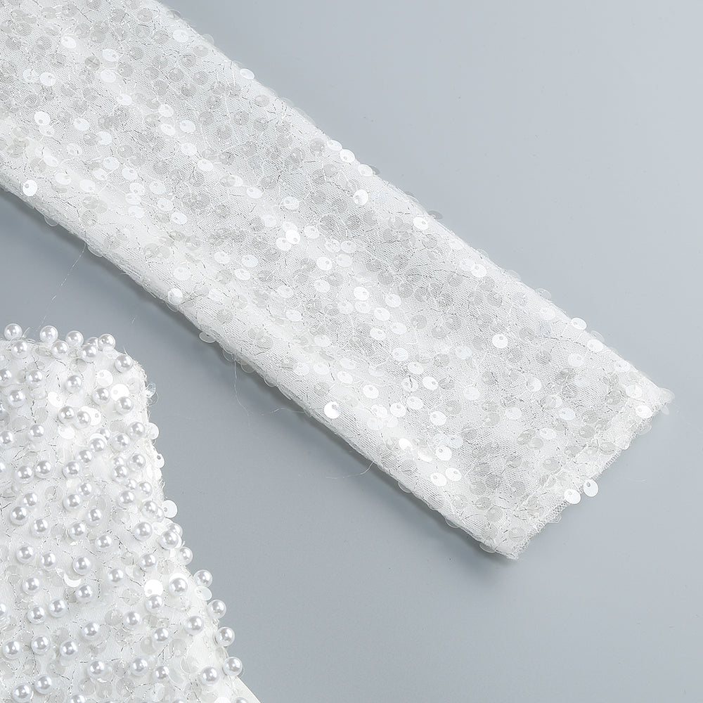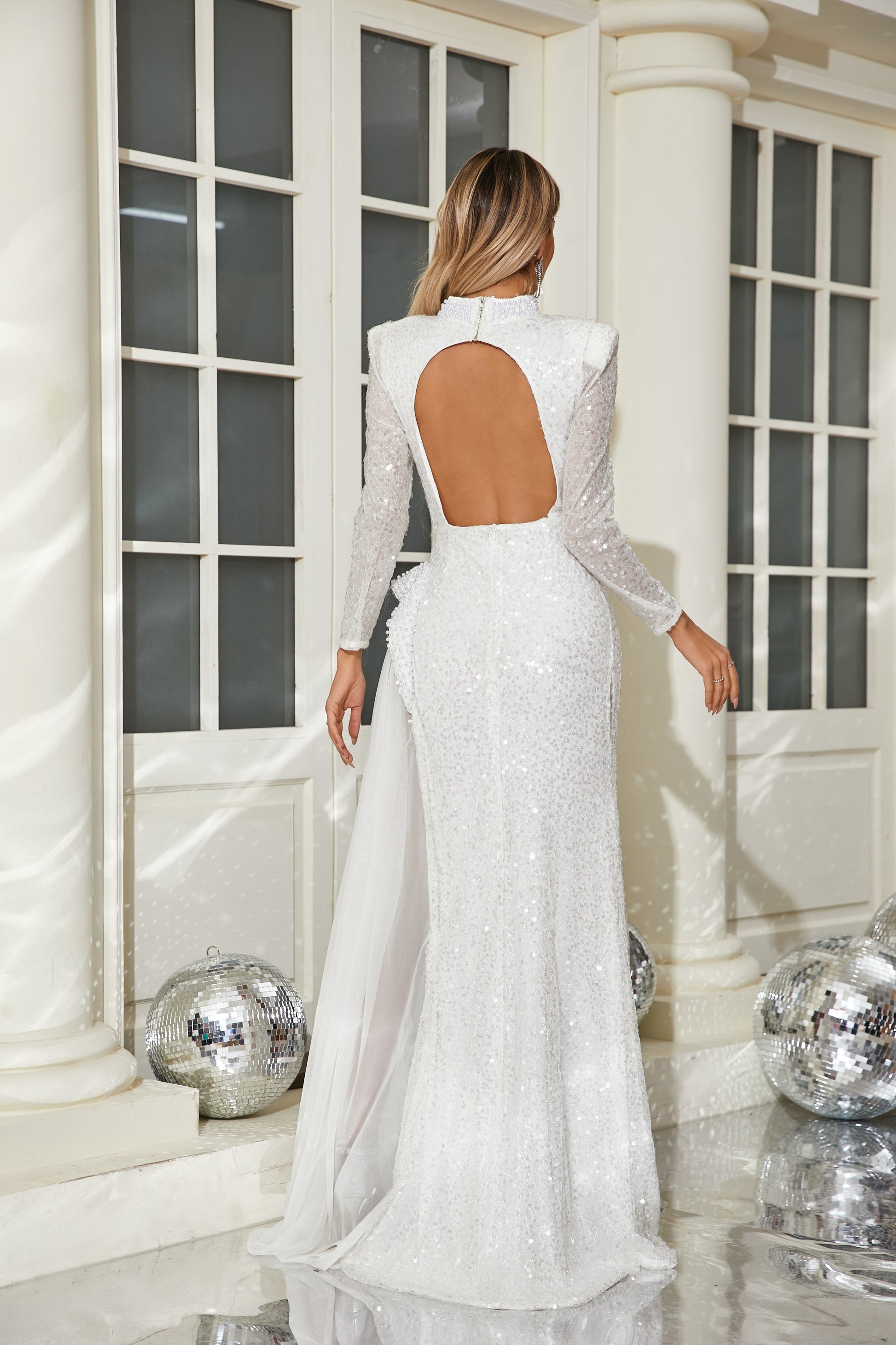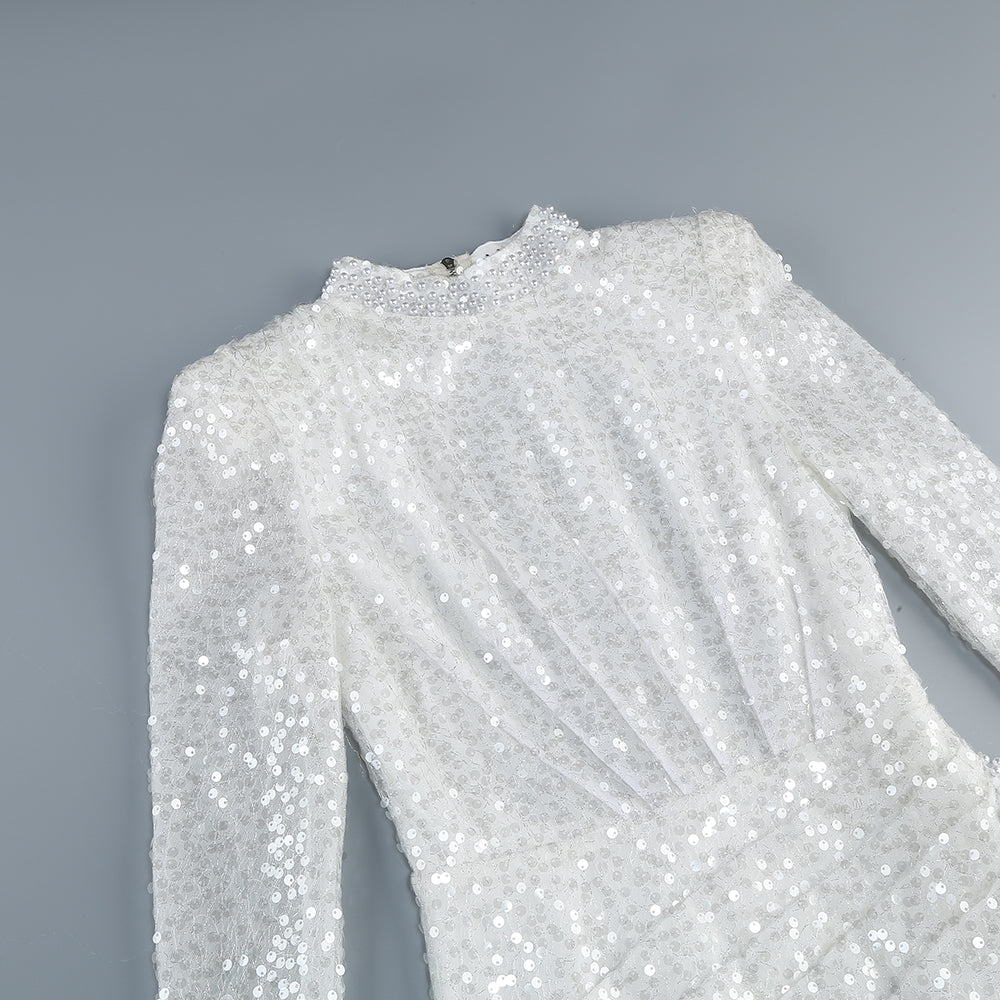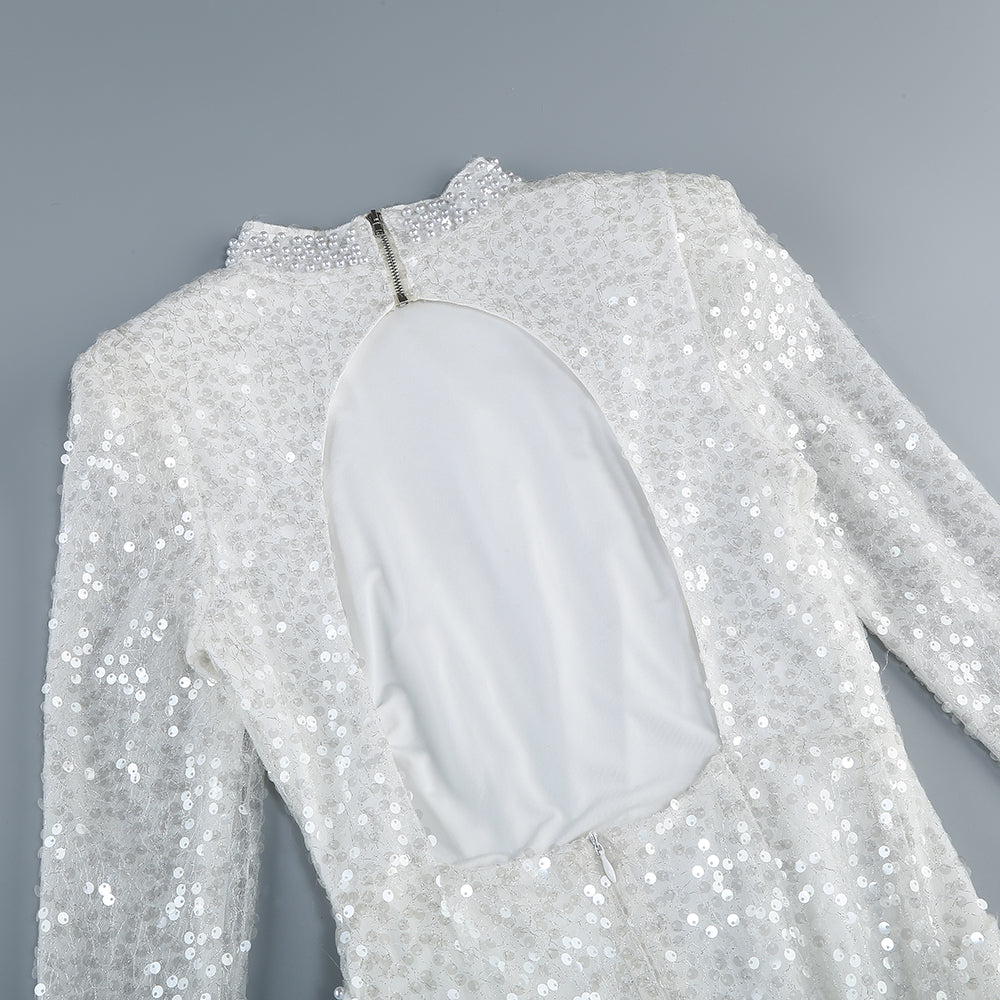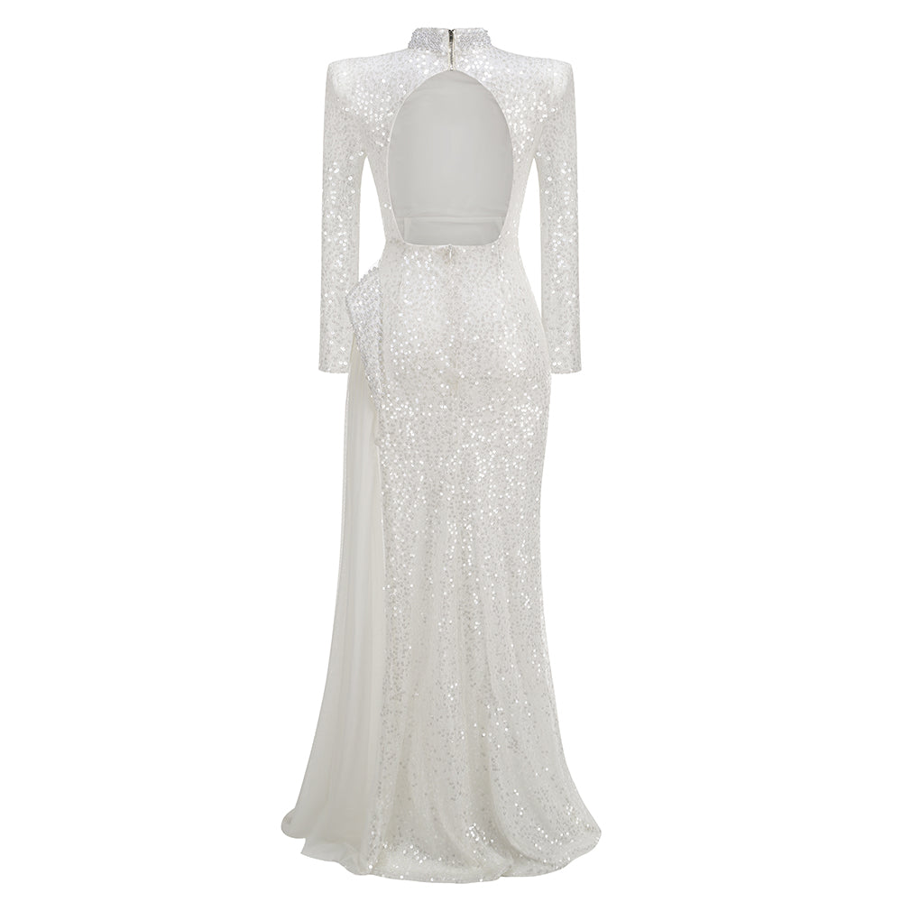Long Sleeve Sequin Pearl Backless Maxi Dress White