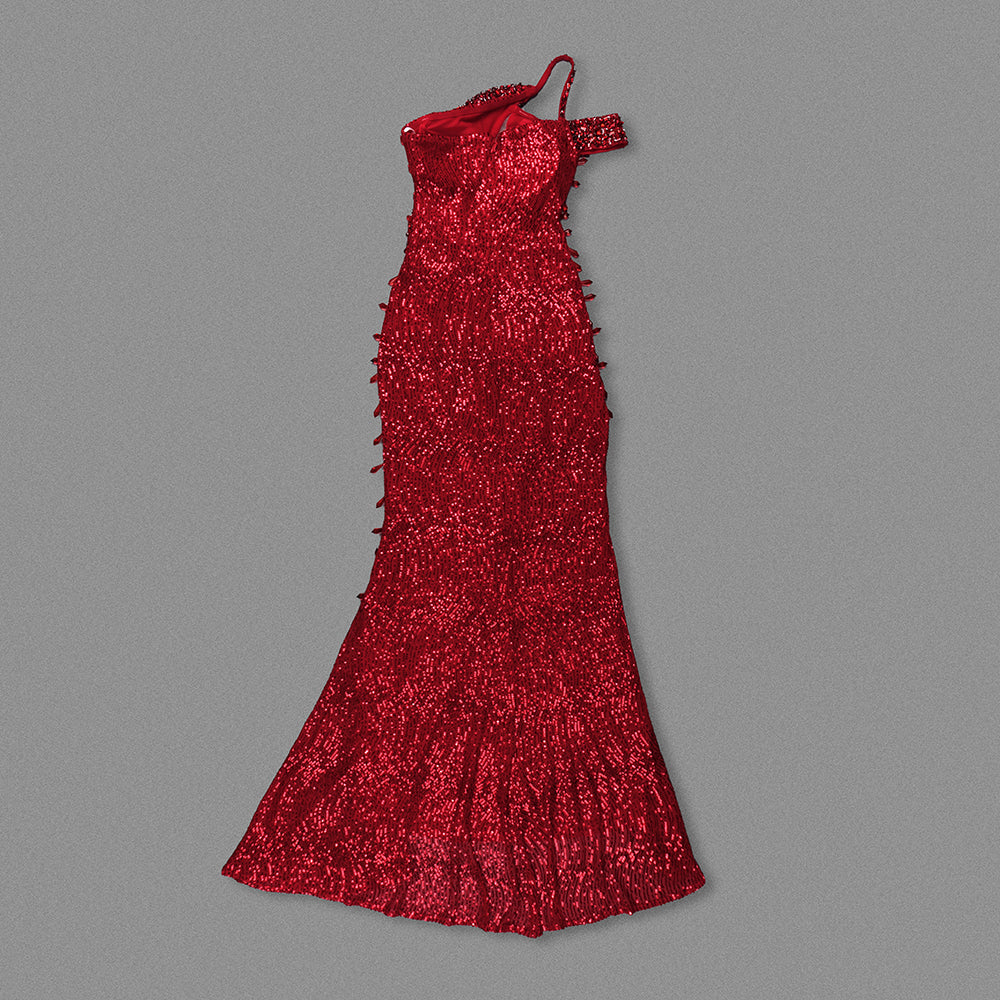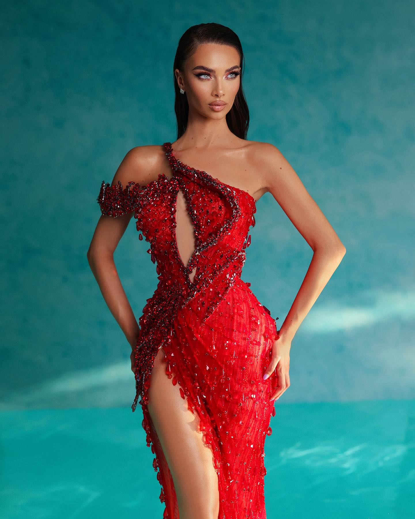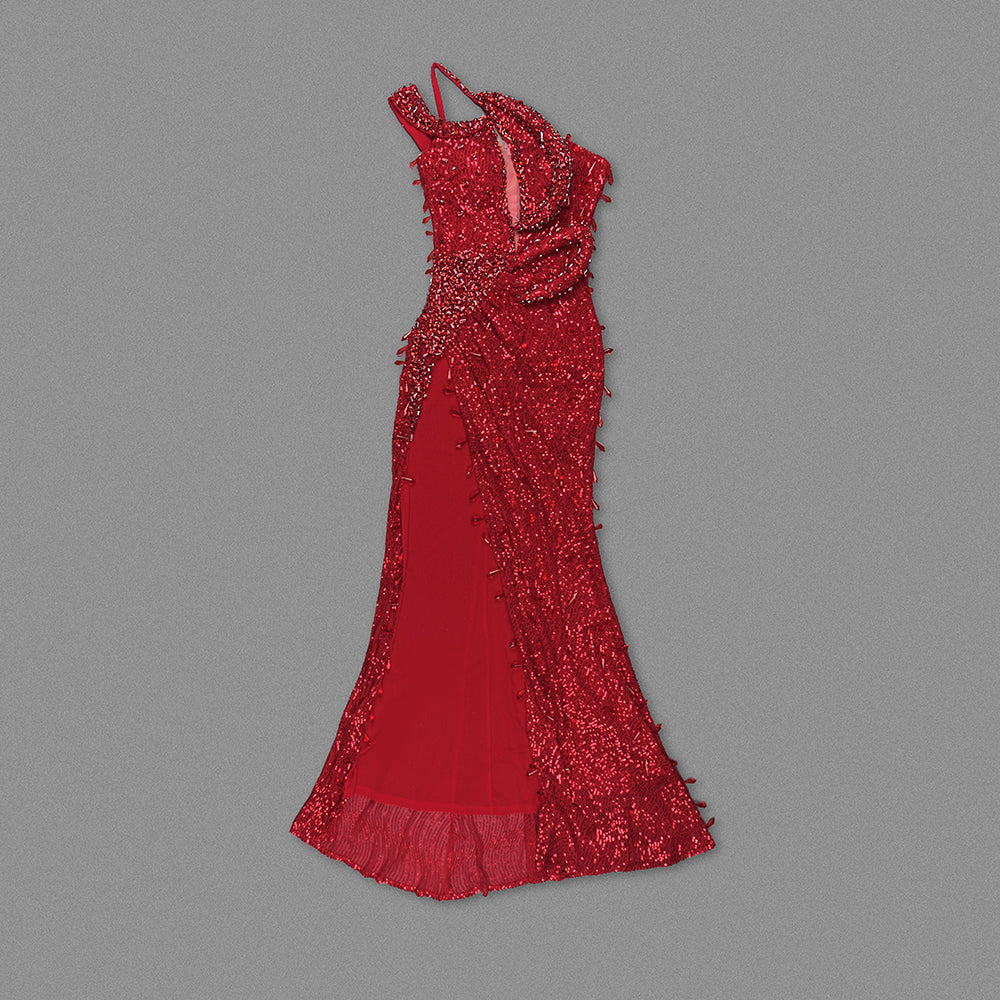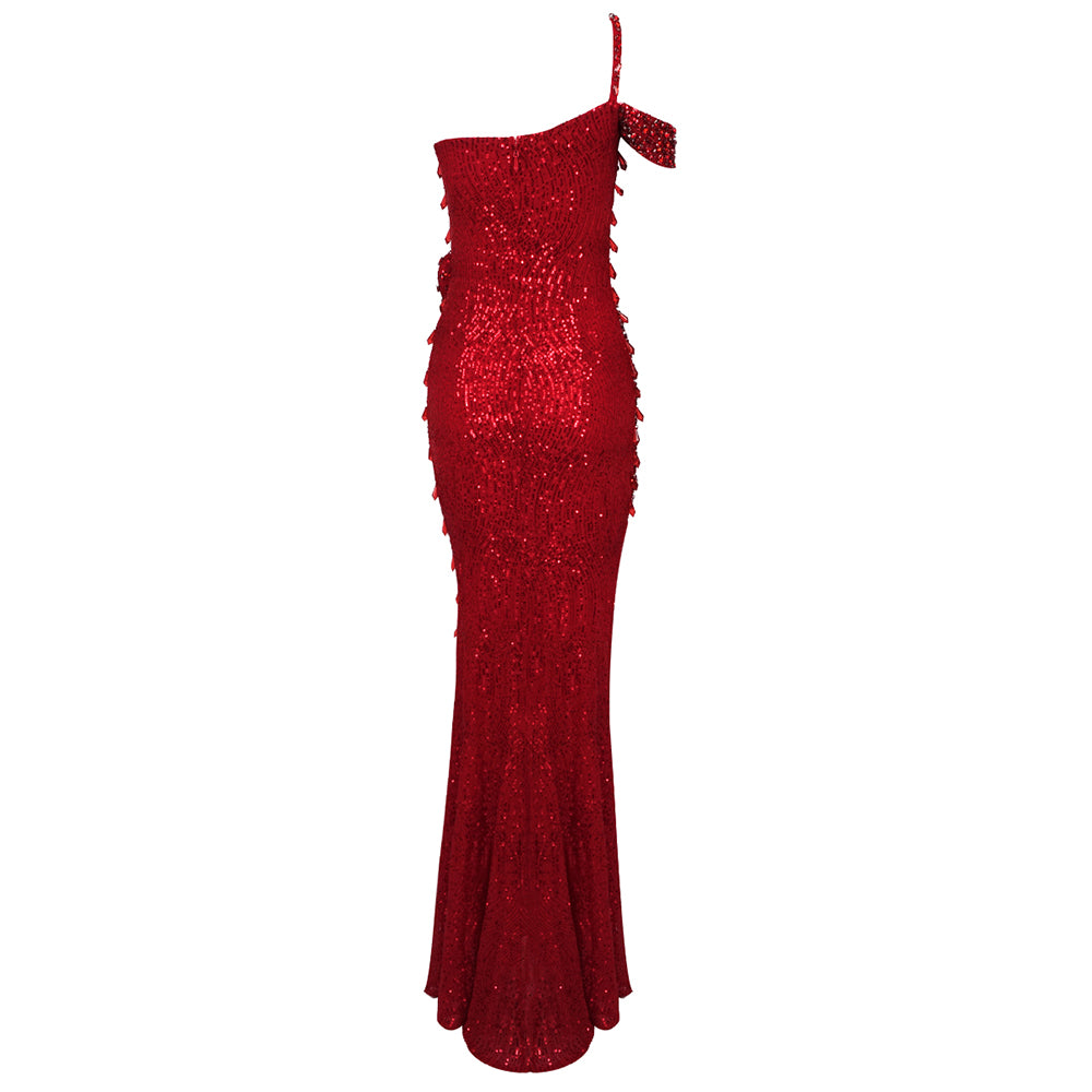 One Shoulder Crystal Sequin Maxi Dress Red HV1710