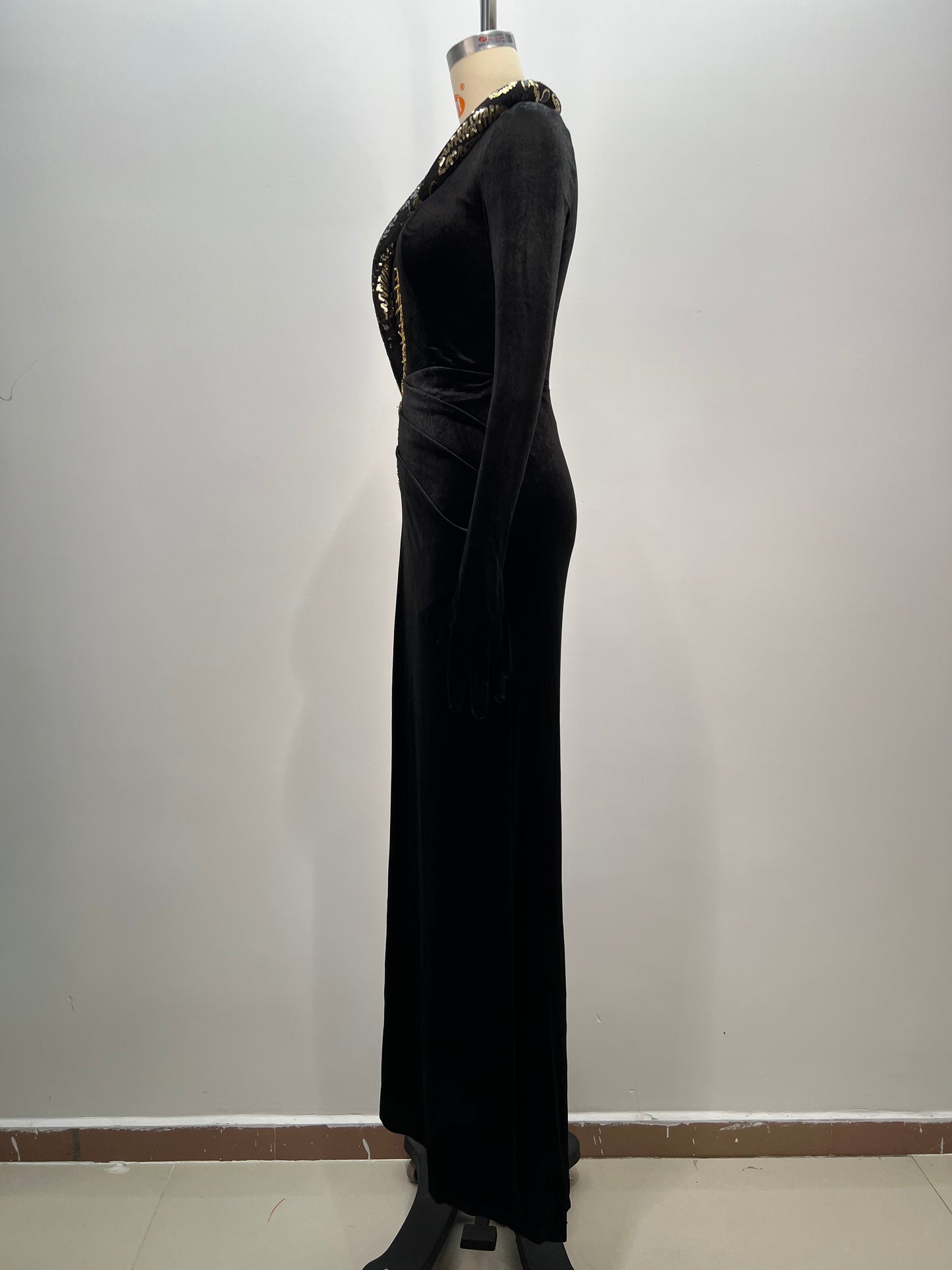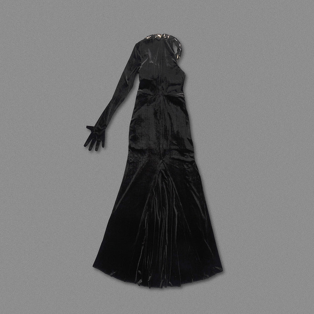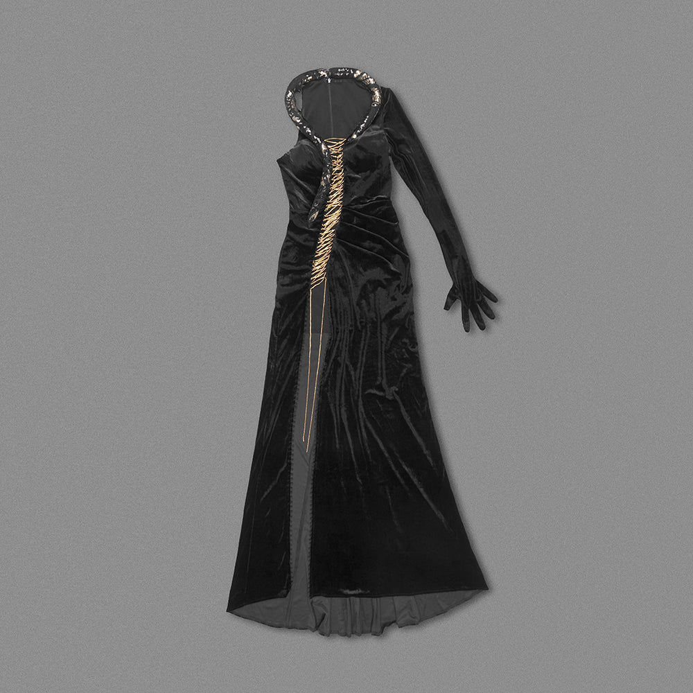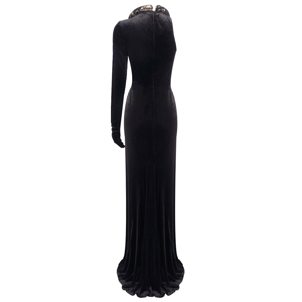 One Sleeve Lace Up Maxi Velvet Dress Black HV1764