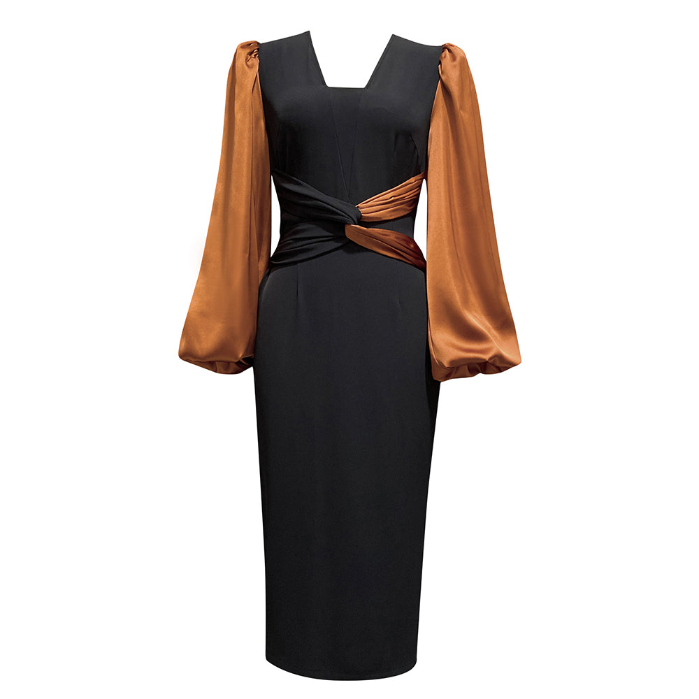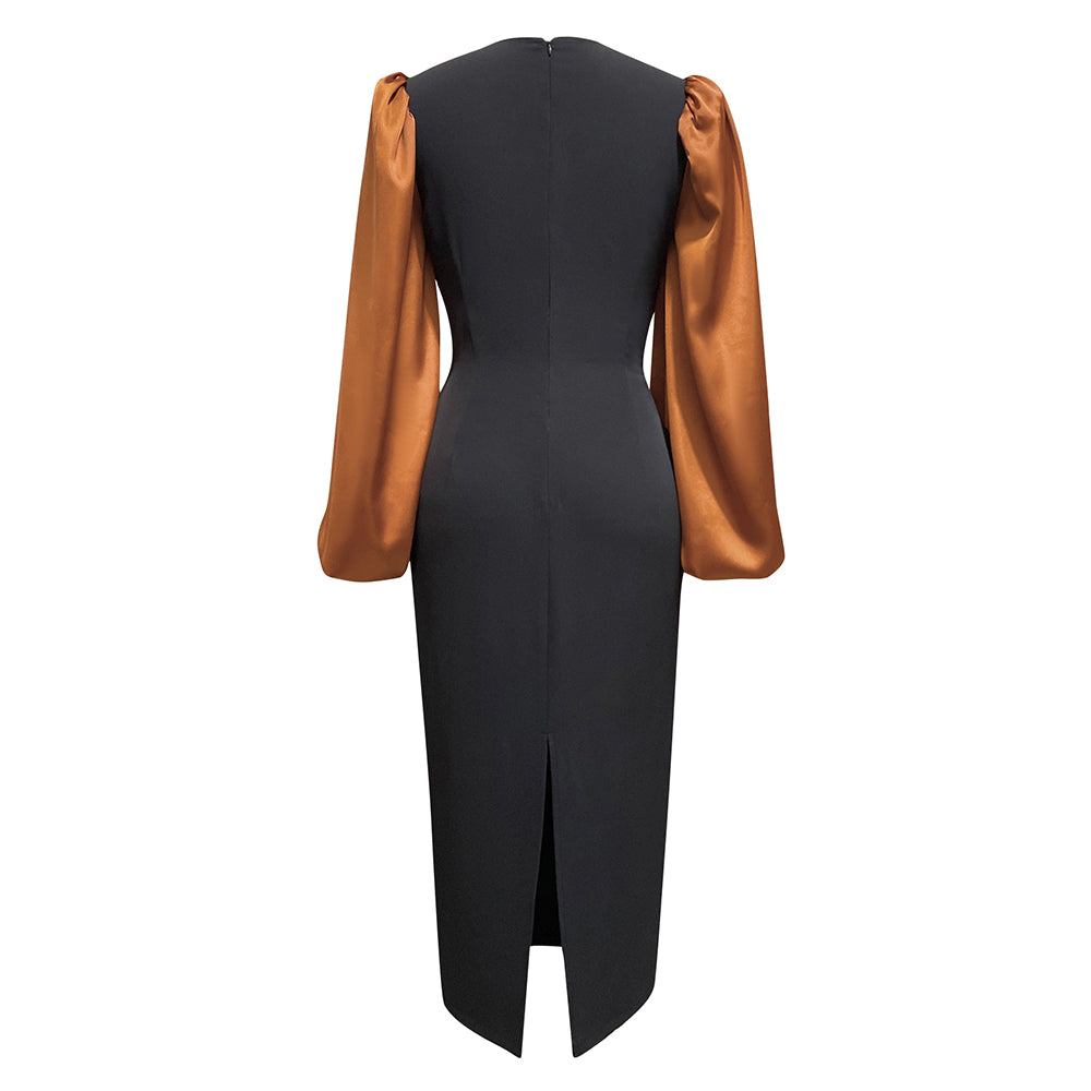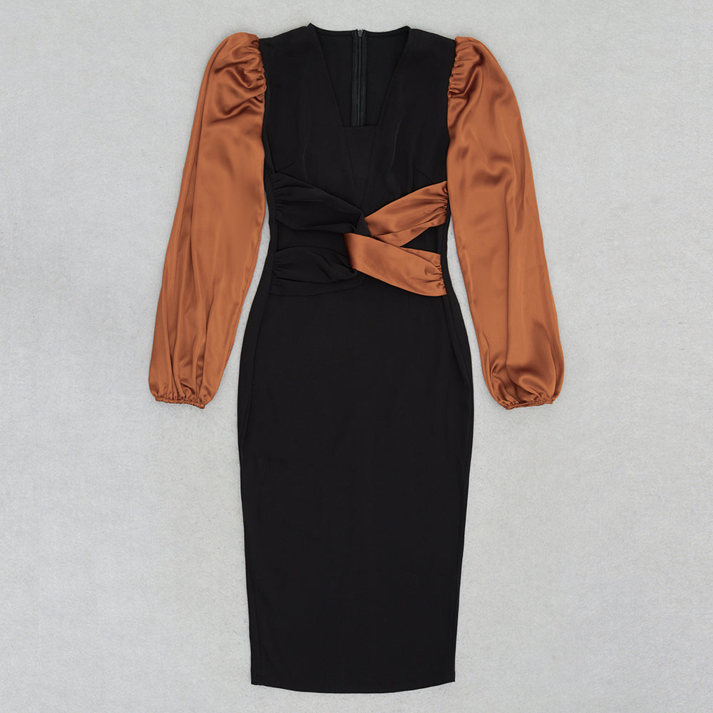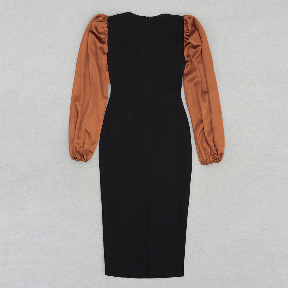 Puff Long Sleeve Midi Dress Black Brown