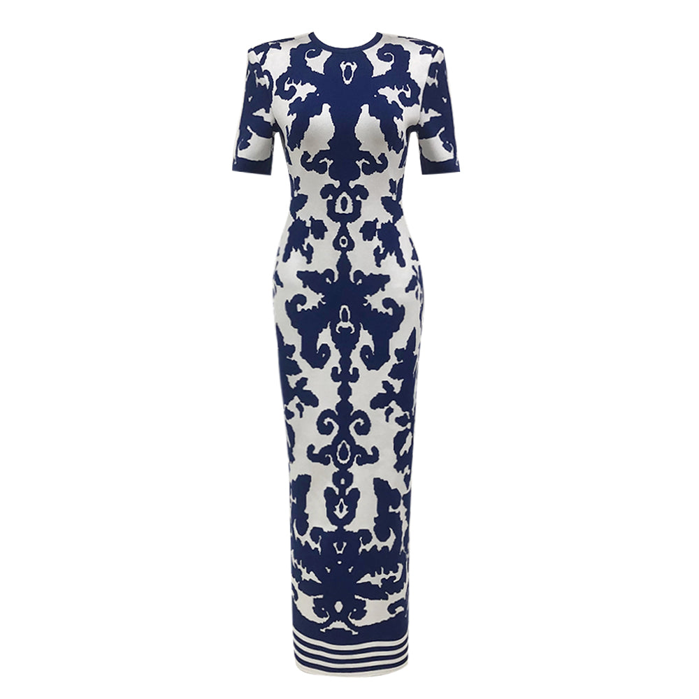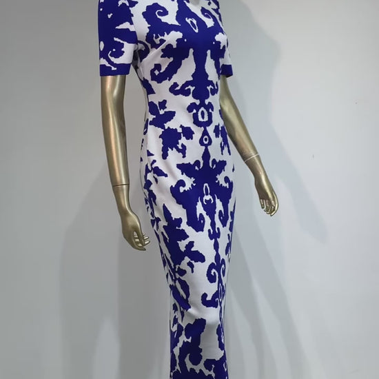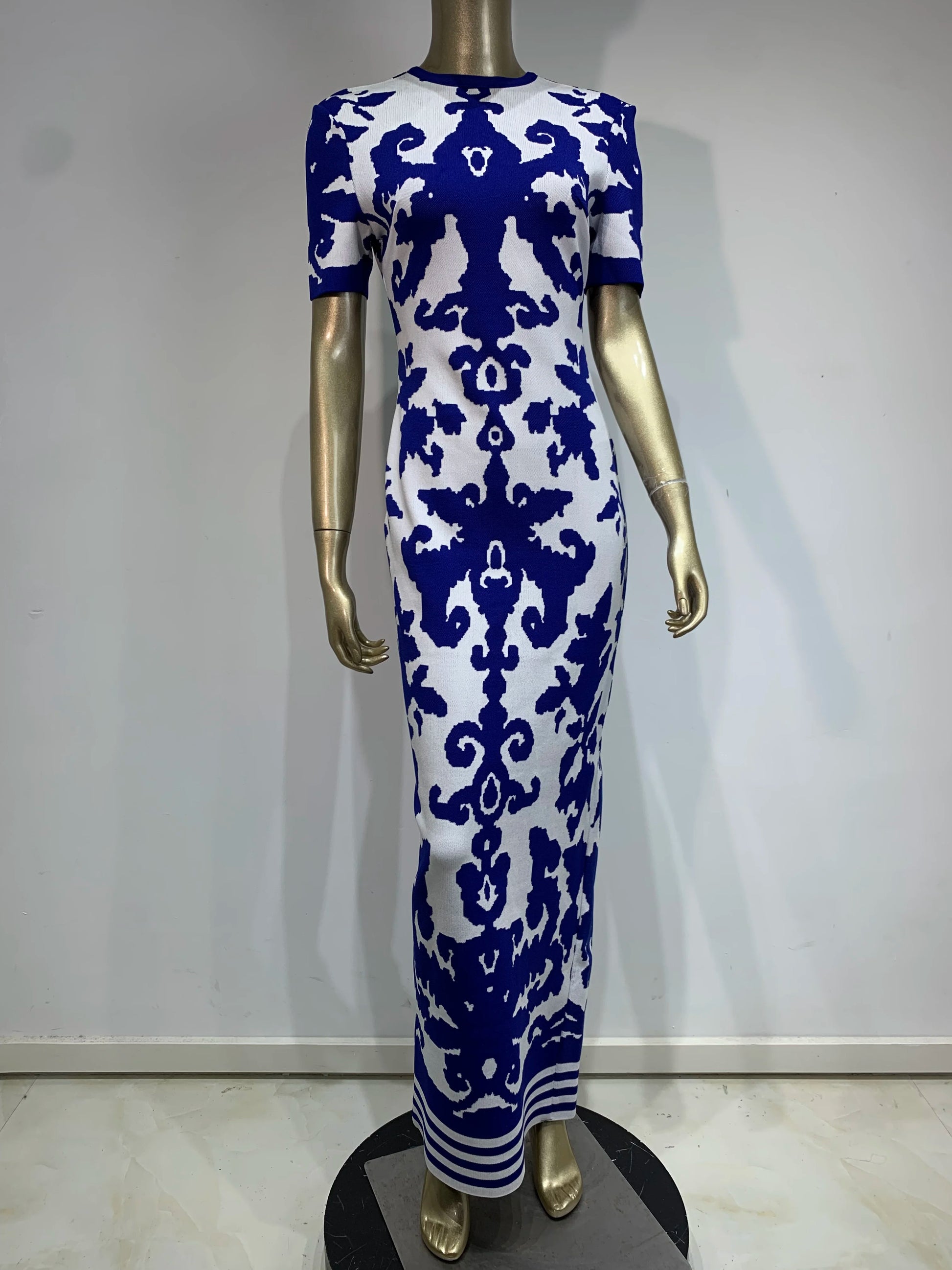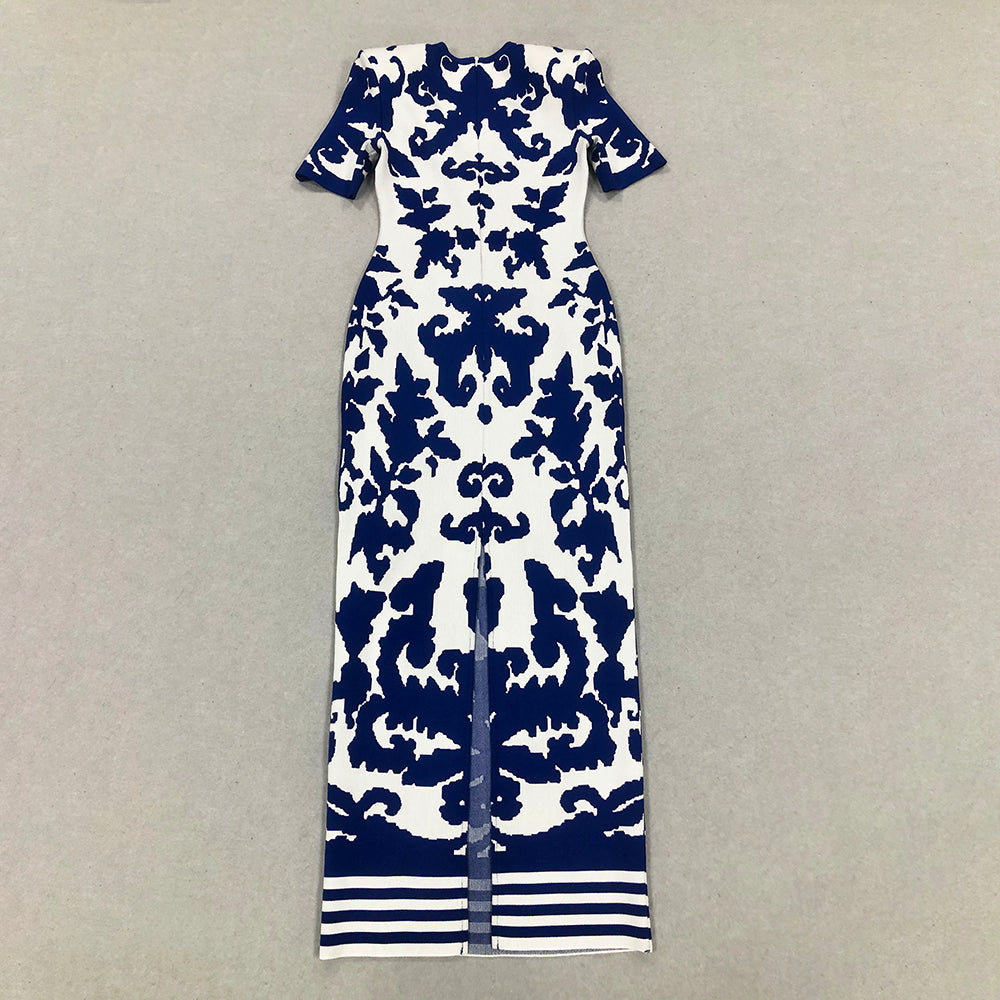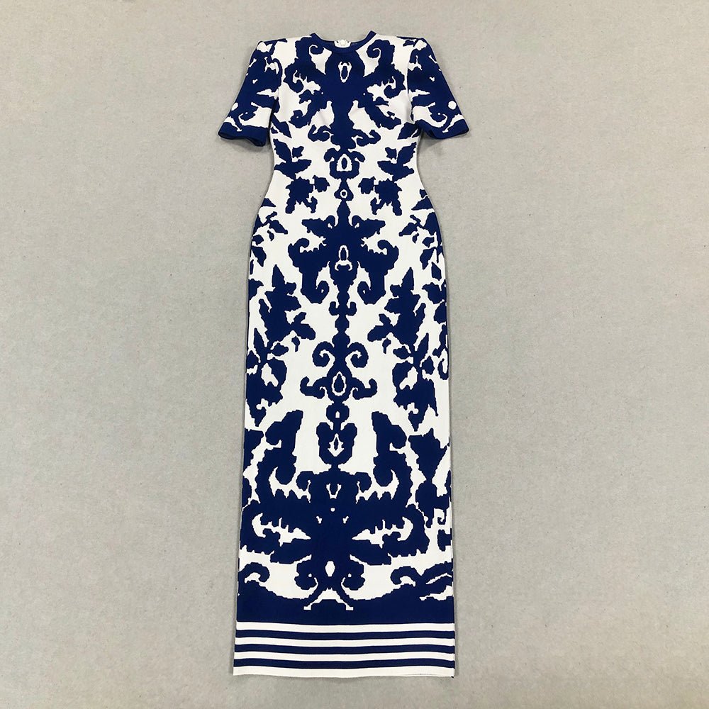 Short Sleeve Printed Maxi Dress Blue White HV1737
