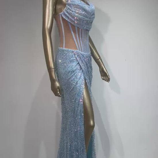 Strapless Draped Corset Sequin Dress Blue HV9732