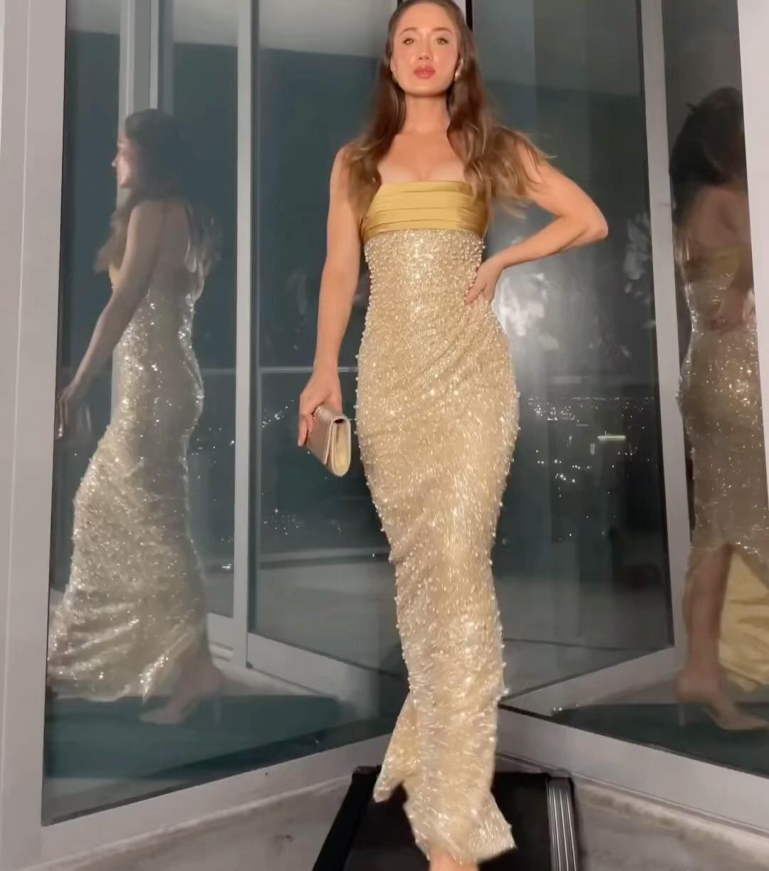 Strapless Pearl Sequin Maxi Dress Gold HV1519