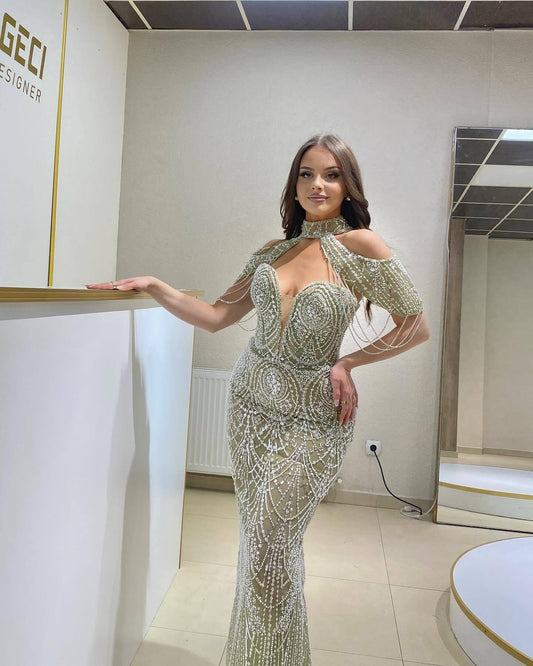 ชุดเดรสยาวเปิดไหล่ประดับคริสตัลและไข่มุก สีเขียว รหัส HV2951