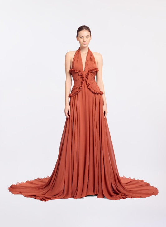 ชุดเดรสยาวคอฮอลเตอร์พร้อมเดรป สีส้ม HV1658