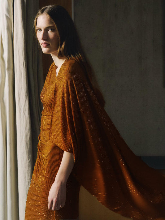 ชุดราตรียาวแขนยาวระยิบระยับสีส้ม HV2796