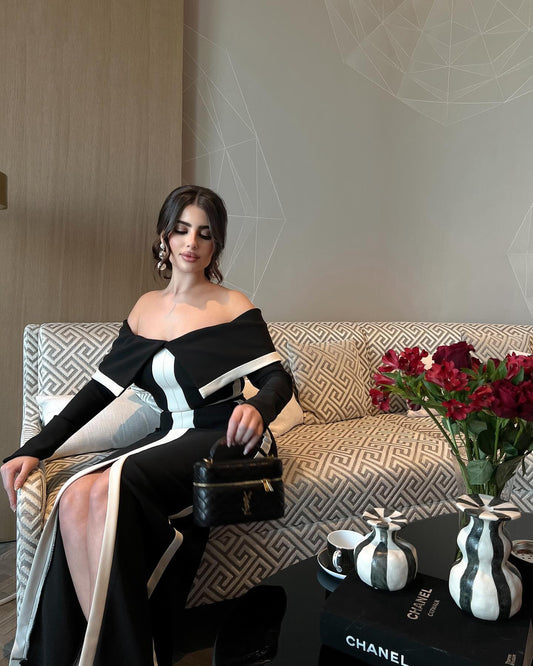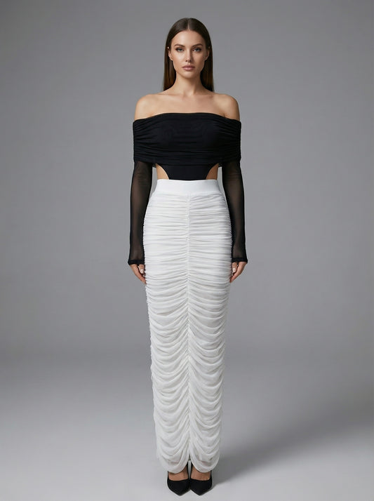 เดรสยาวทรงปาดไหล่ผ้าเดรปแขนยาว สีขาวดำ HV2779