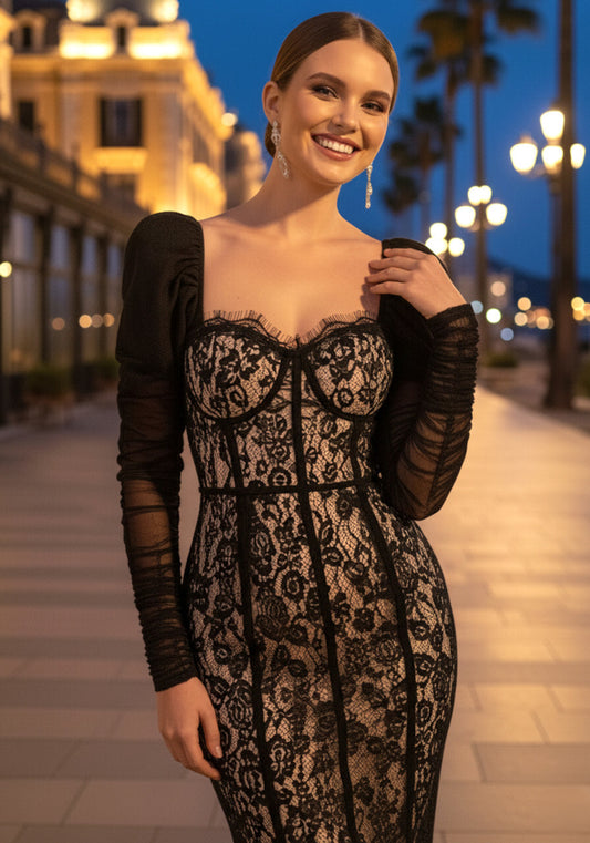 泡泡袖蕾丝长款连衣裙 黑色 HV2641