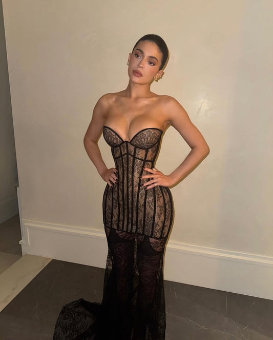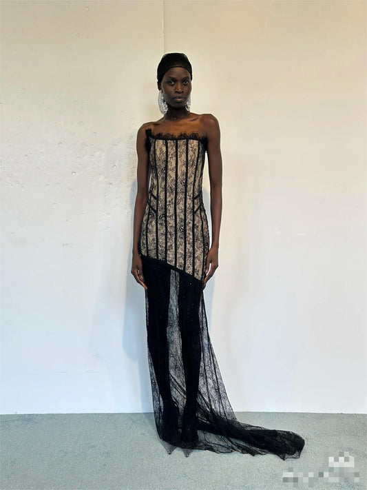 黑色无肩带蕾丝紧身胸衣A字型曳地连衣裙 HV2809