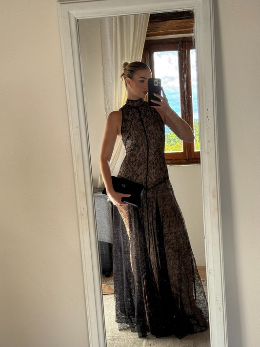 扇形蕾丝露背长款连衣裙 黑色 HV2421