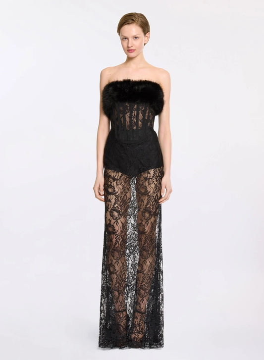 无肩带毛皮蕾丝超长连衣裙 黑色 HV2701